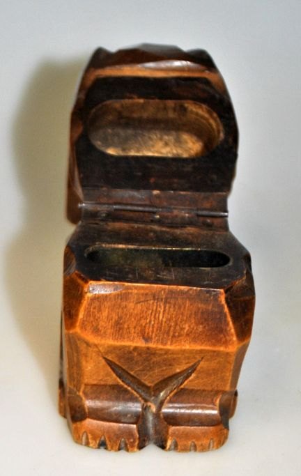 Blækhus formet som en bulldog, 19. årh. Udskåret birketræ med glasøjne. Indvendig blækhus i jernblik. H: 9 cm.