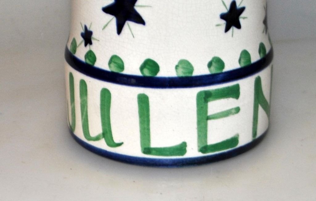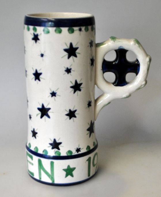 Aluminia mug, 502/455. Christmas 1906, Copenhagen, Denmark. Decorated in blue and green with i.a. stars. H .: 17 cm. Stamped.