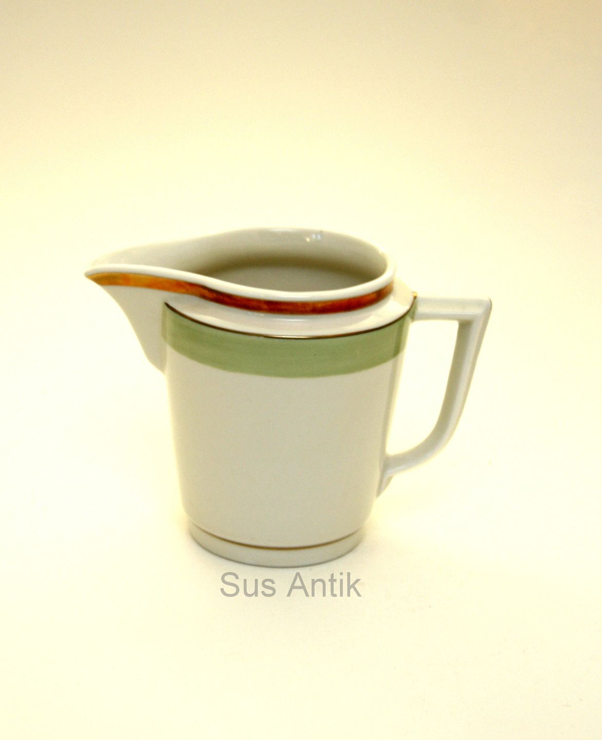 Text available in Danish: Royal Copenhagen, Broager. Cremet stel med lysegrøn bort og guldkanter. Flødekande. Højde 9 cm. Diameter 7,5 cm. Nr. 9480. II. sortering. Pris: 150 kr. stk. Lager: 1