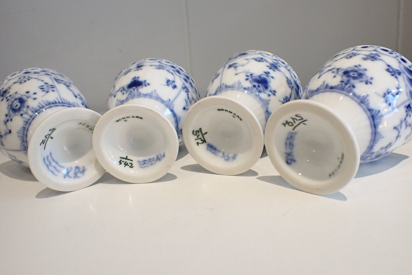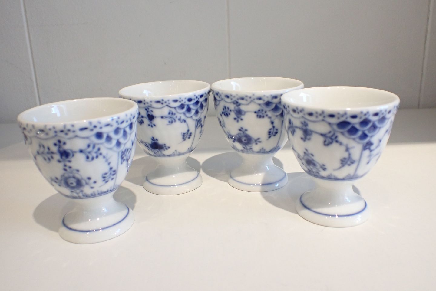Text available in Danish: 4 stk. Kgl. Musselmalet halvblonde æggebægre. Efter 1923. Dessin nr. 542. 1. sortering. Højde: 6,1 cm. I fin stand. Sælges enkeltvis 400 kr. Pr. stk.