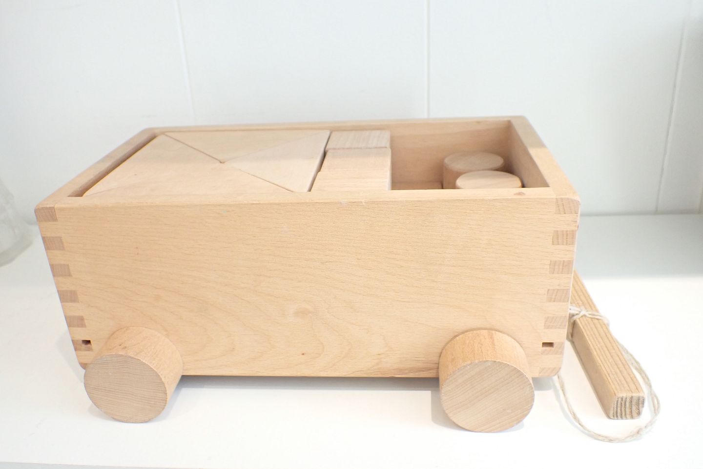 Text available in Danish: Kay Bojesen trækvogn med klodser.