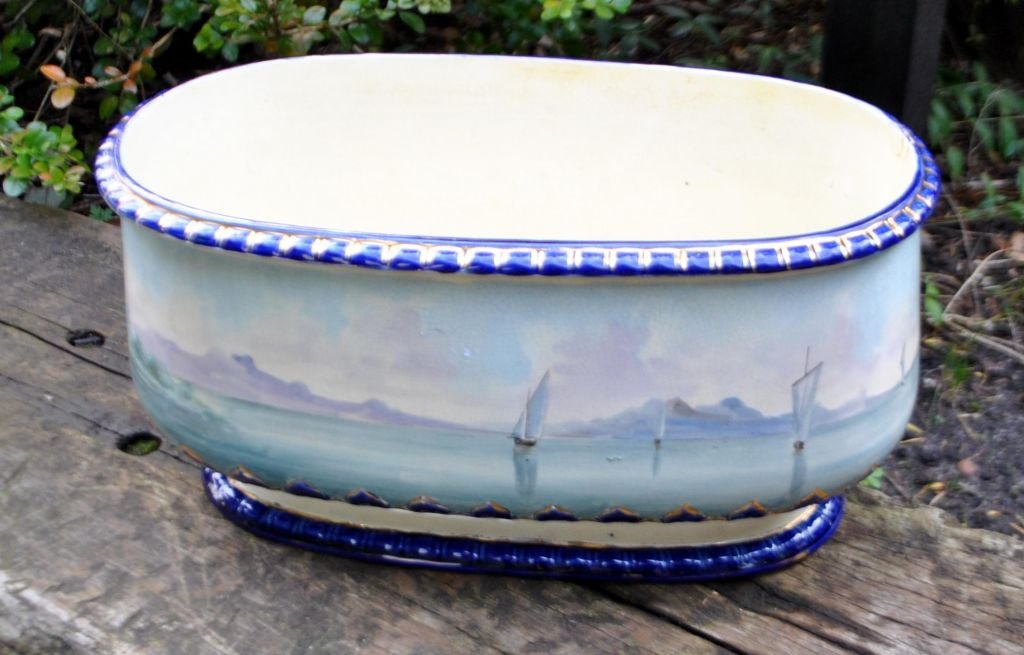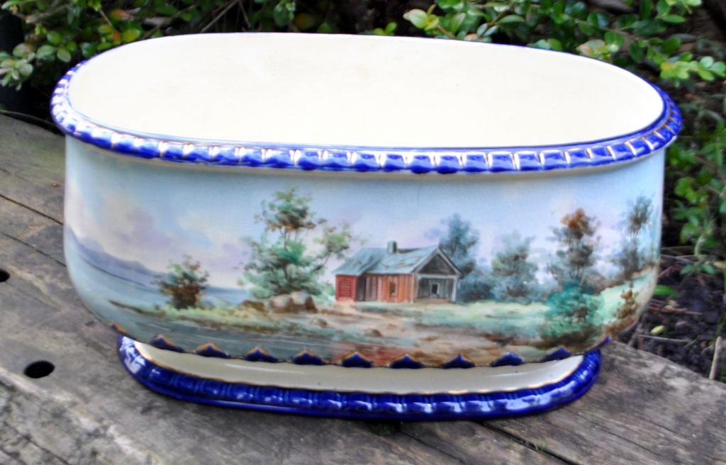 Rørstrand hand-painted earthenware jardiniere in faience, 19th century, Sweden. Motif depicting log cabin by the water, where there are numerous sailing ships. Oval. Polychrome decoration. With gildings. H .: 16 cm. L .: 32 cm.