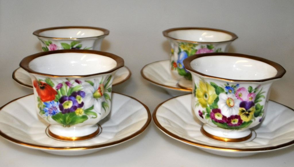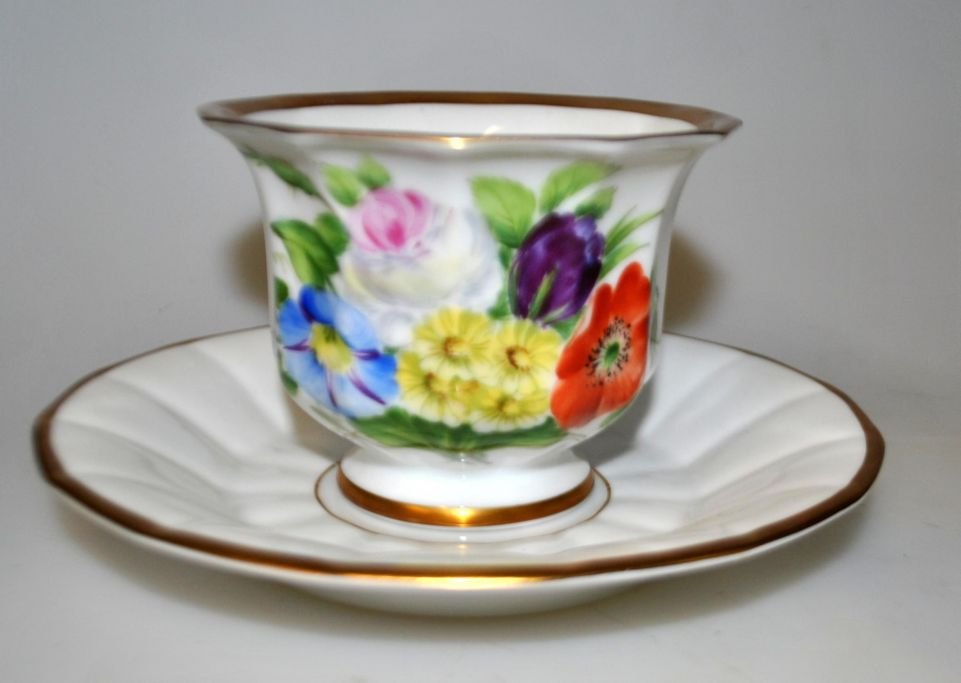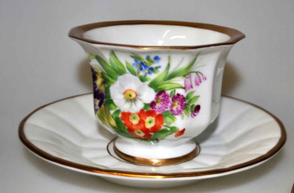 Bing & Grøndahl stor kantet kaffekop med underkop, no. 98, håndbemalet med blomster, 1915 - 1948, København, Danmark. Med kant forgyldning. H.: 7,2 cm. Dia kop: 9,7 cm.