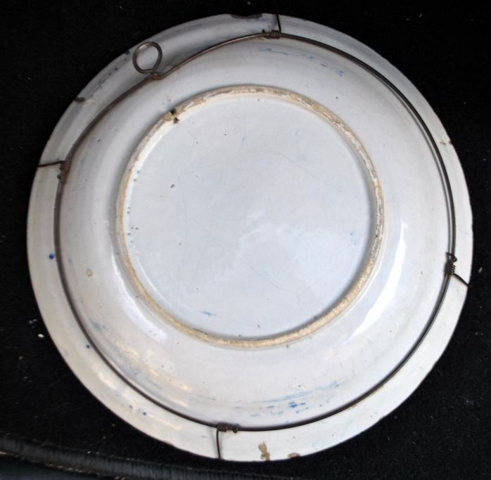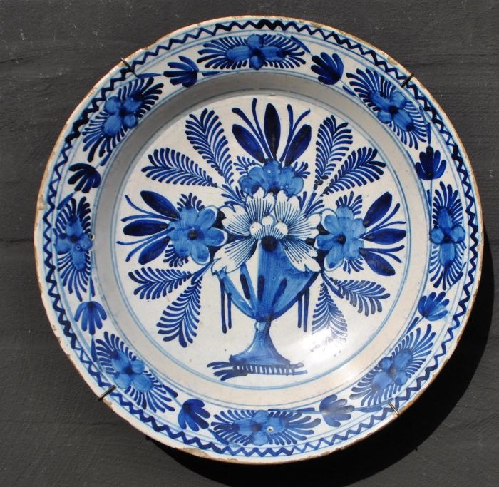 Delft dish, 18th century. Blue / white faience. Netherlands. Center field decorated with flowers in a vase. Edge decorated with flowers. Dia .: 31 cm.