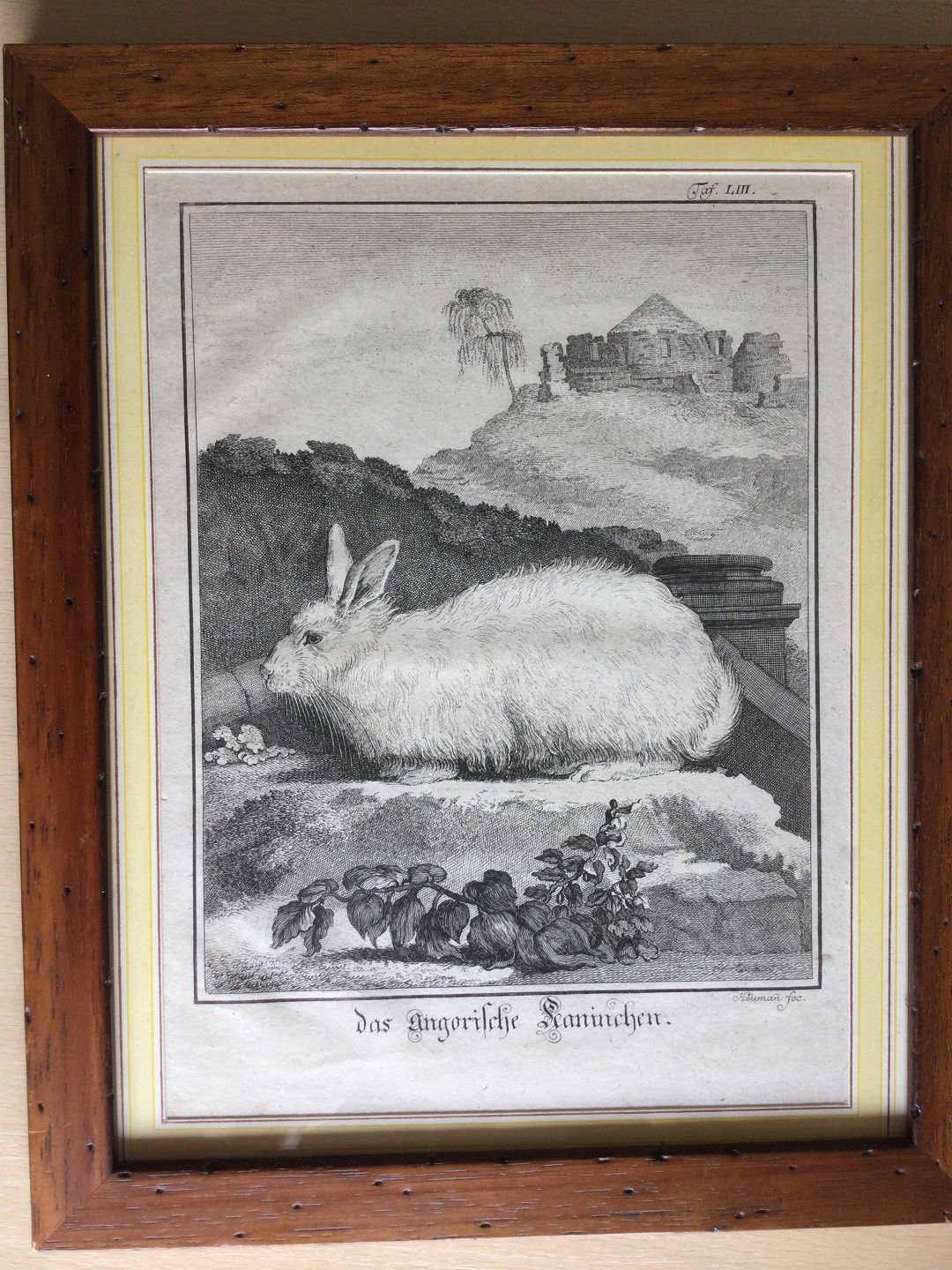 Kobberstik af Georg Daniel Heumann ca. 1760 - Angora kanin i landskab.