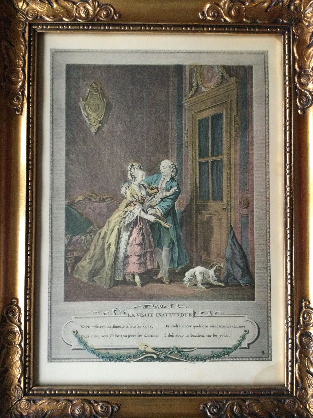 Koloreret kobberstik "La Visite Inattendue" af Nicolas Joseph Voyez.