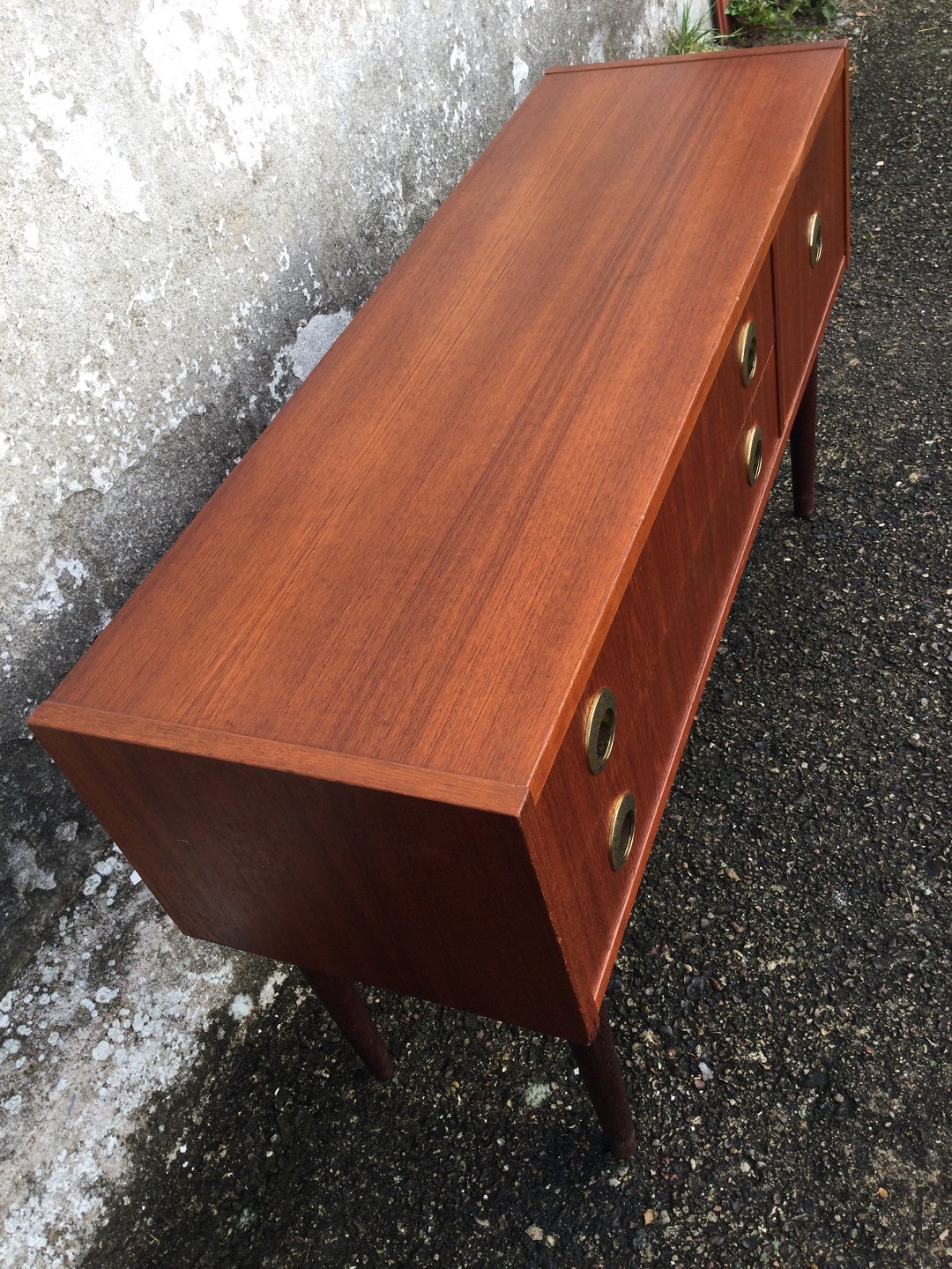 Low entrance hall furniture, chest of drawers in teak veneer with three drawers, Scandinavian modern from the 1960s. Dimensions: HxWxD 52x85.5x29.5 cm. Nice condition