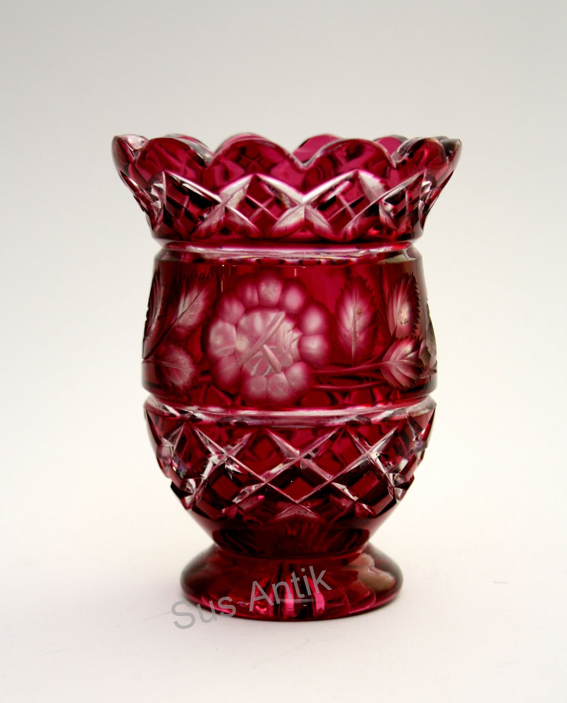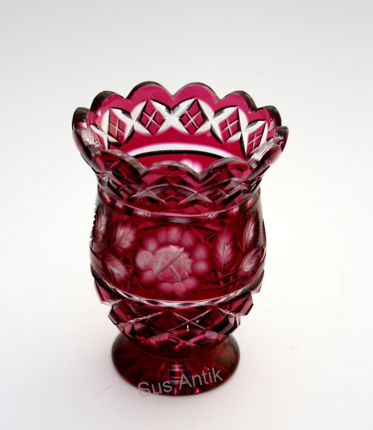 Bøhmisk krystal, Rubinrød vase med blomster, blade og krydsslibninger. Højde 11 cm. Øverste diameter 8,3 cm. Pris: 300 kr.
