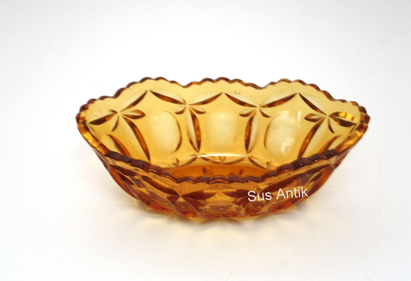 Fyens Glasværk, Rolf ravgul presset glas. Produceret fra 1934 og frem. Jardiniere (oval skål). Længde 18 cm. Bredde 10 cm. Højde 6 cm. Pris: 150 kr. stk. Lager: 3