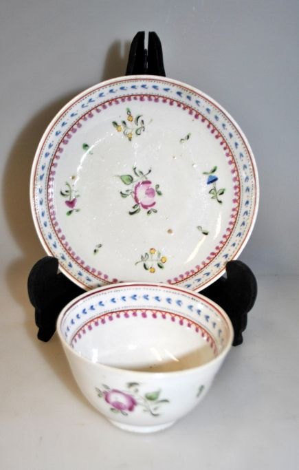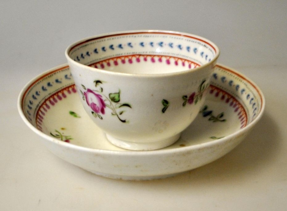 Chinese cup with saucer, 19th century. Hand-painted decorations with geometric patterns and red flowers. H .: 5.5 cm. Dia. saucer: 14.4 cm.