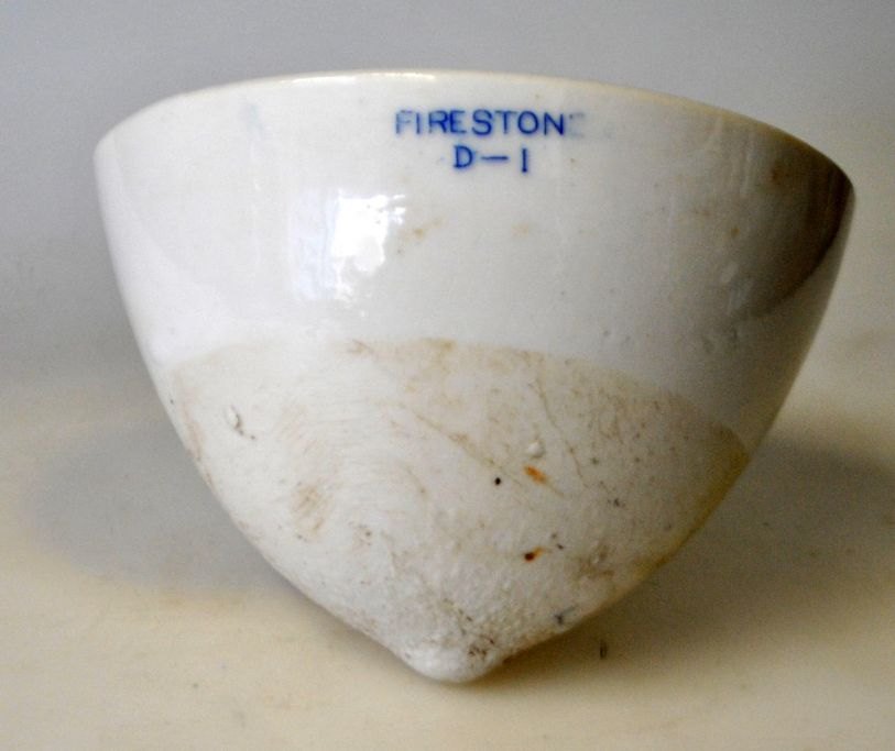 Sjælden latex gummi opsamler kop af porcelæn, ca. 1940 fra Firestone Plantagen, Liberia. H. 8,5 cm. Dia: 12 cm På siden teksten Firestone D - 1 (område). Firestone Plantagen i Harbel, Liberia, er verdens største sammenhængende gummiplantage, etableret i 1926. Ejet af Bridgestone, USA. Proveniens: Direktøren.