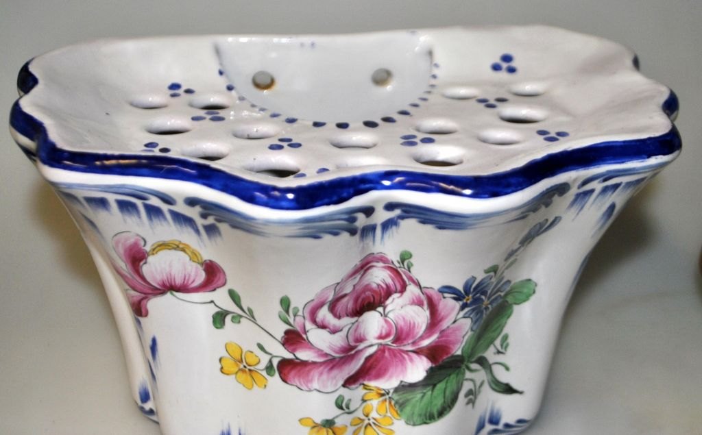 Tysk væg jardiniere i bemalet fajance, 1932. Hvid skærv med blomsterdekorationer, polykrom bemalet. Rococo form. Stemplet. H.: 11,5 cm. B.: 20,5 cm.