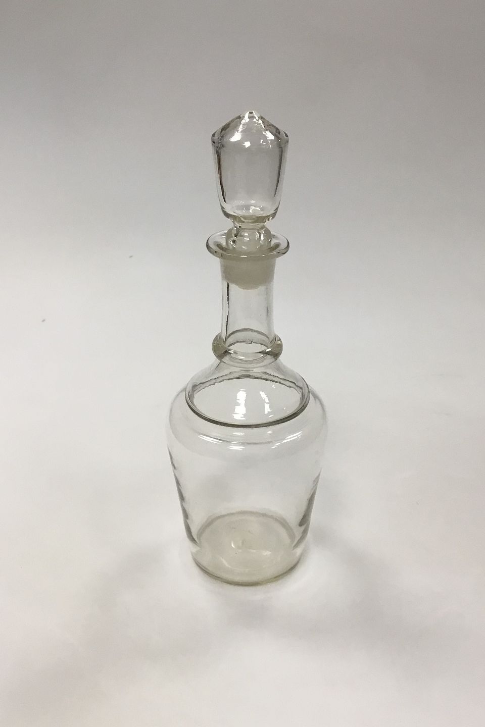 Holmegaard Glaskaraffel cylinderform, rigel om hals, hul prop, knækket af i bunden. Fra slutningen af 19. århundrede. Måler 26 cm ( 10 15/64 in. )