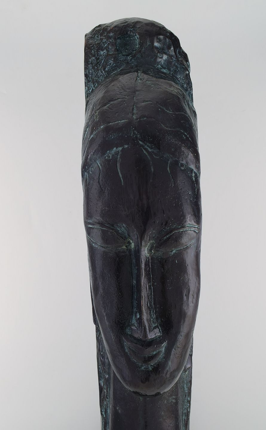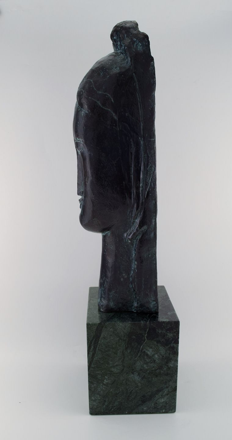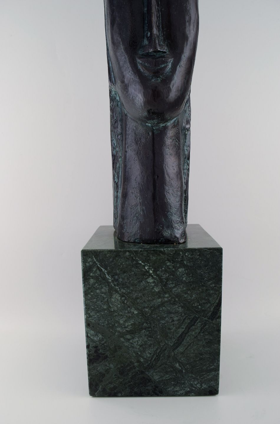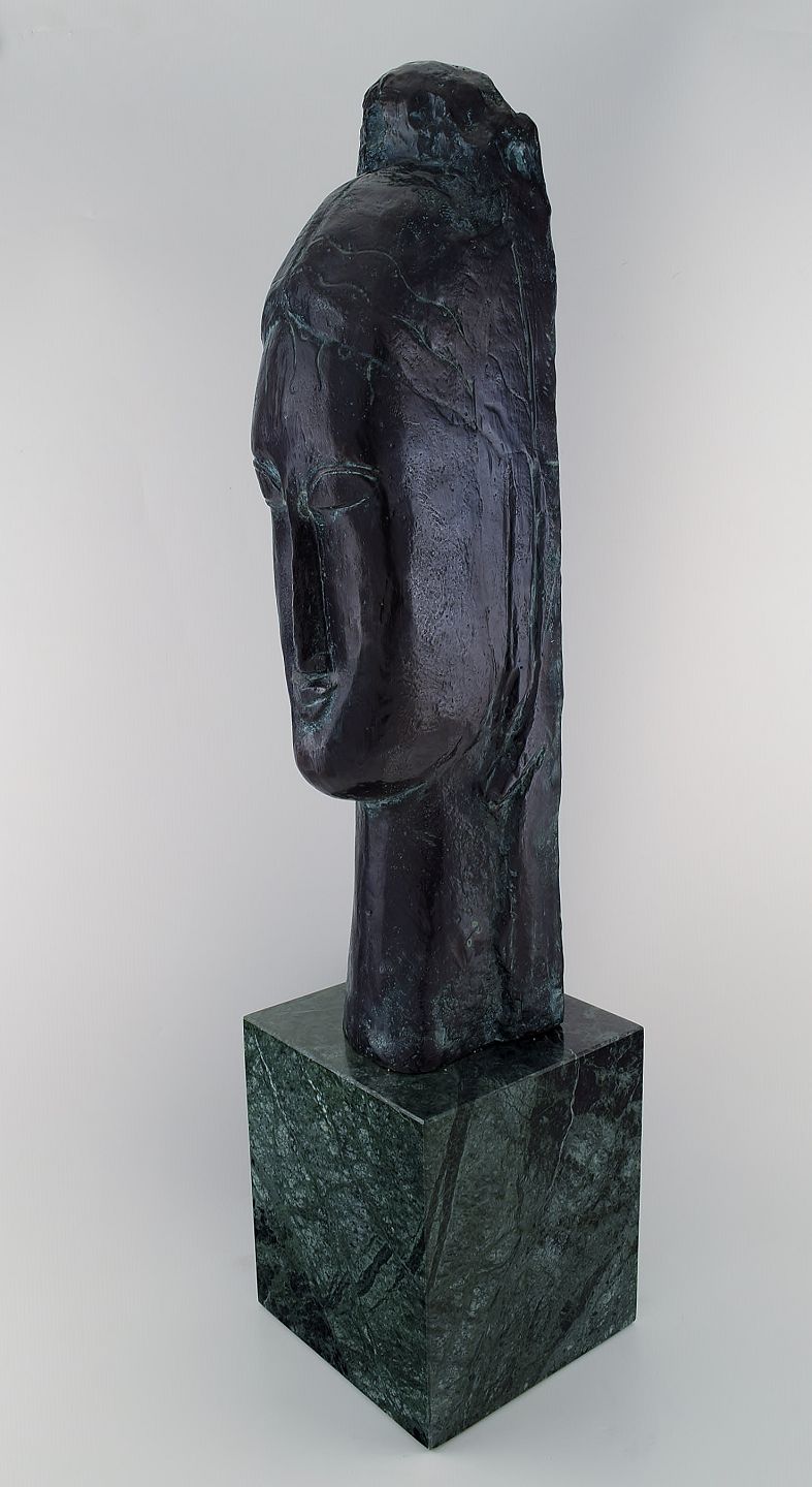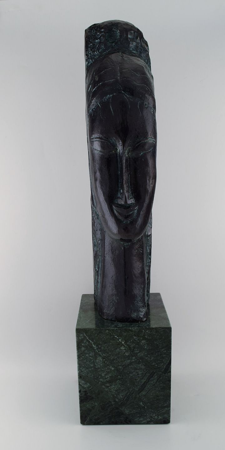 Amedeo Clemente Modigliani (1884–1920) d´après. "Tête de jeune femme". Large bronze sculpture in solid bronze on green marble base. Bronze foundry: Ebano, Spain. Limited edition 38/48. Heavy bronze sculpture in high quality. Late 20th century.