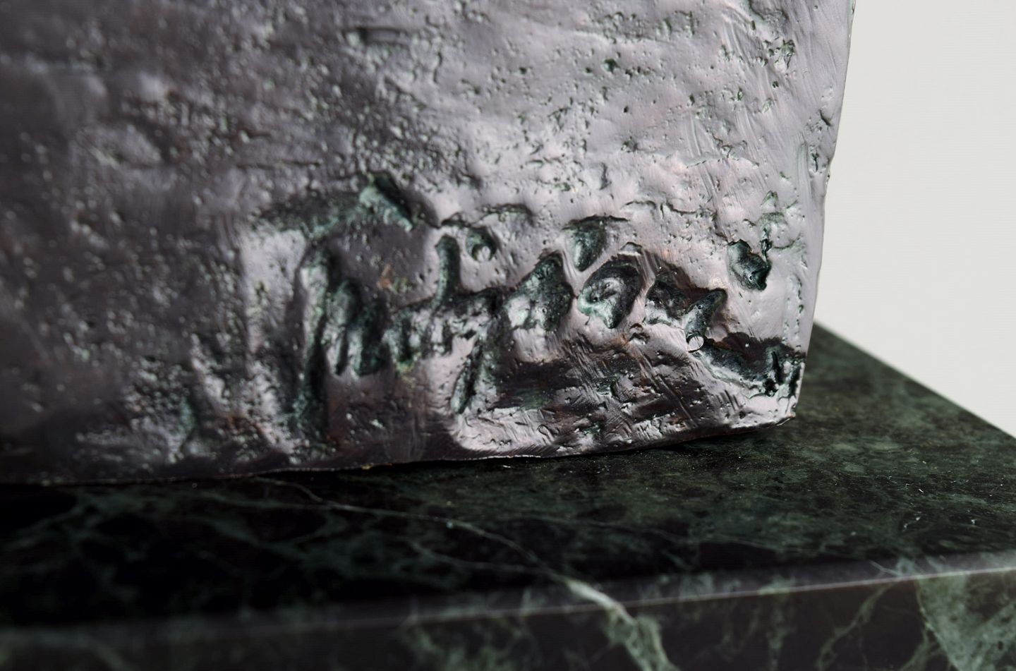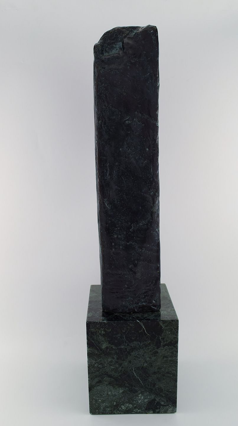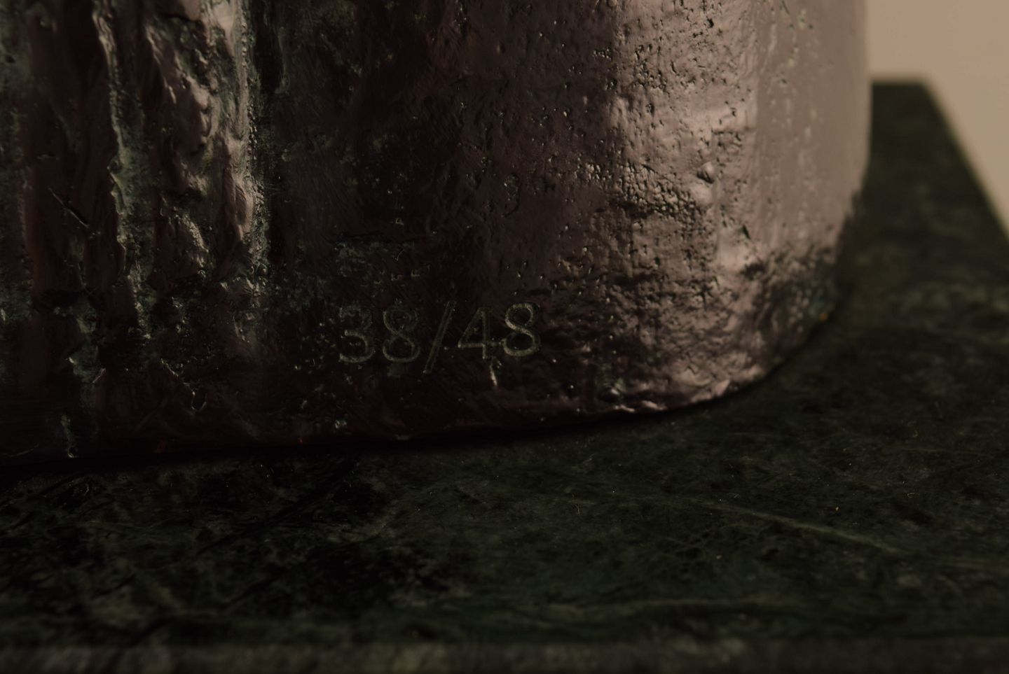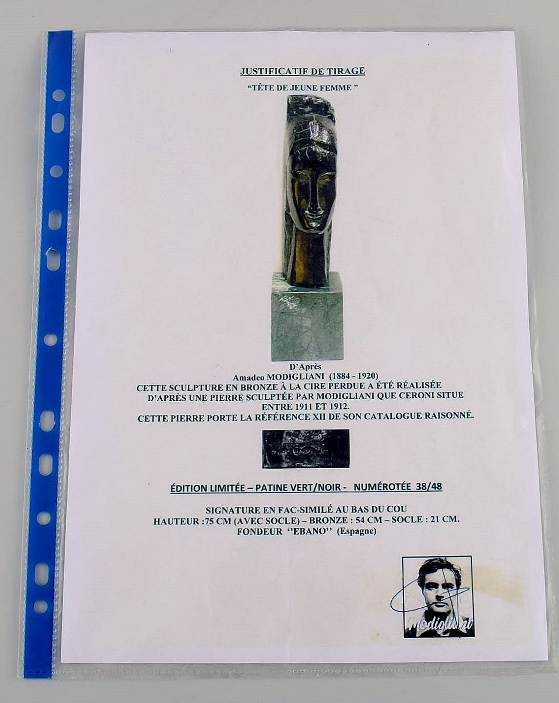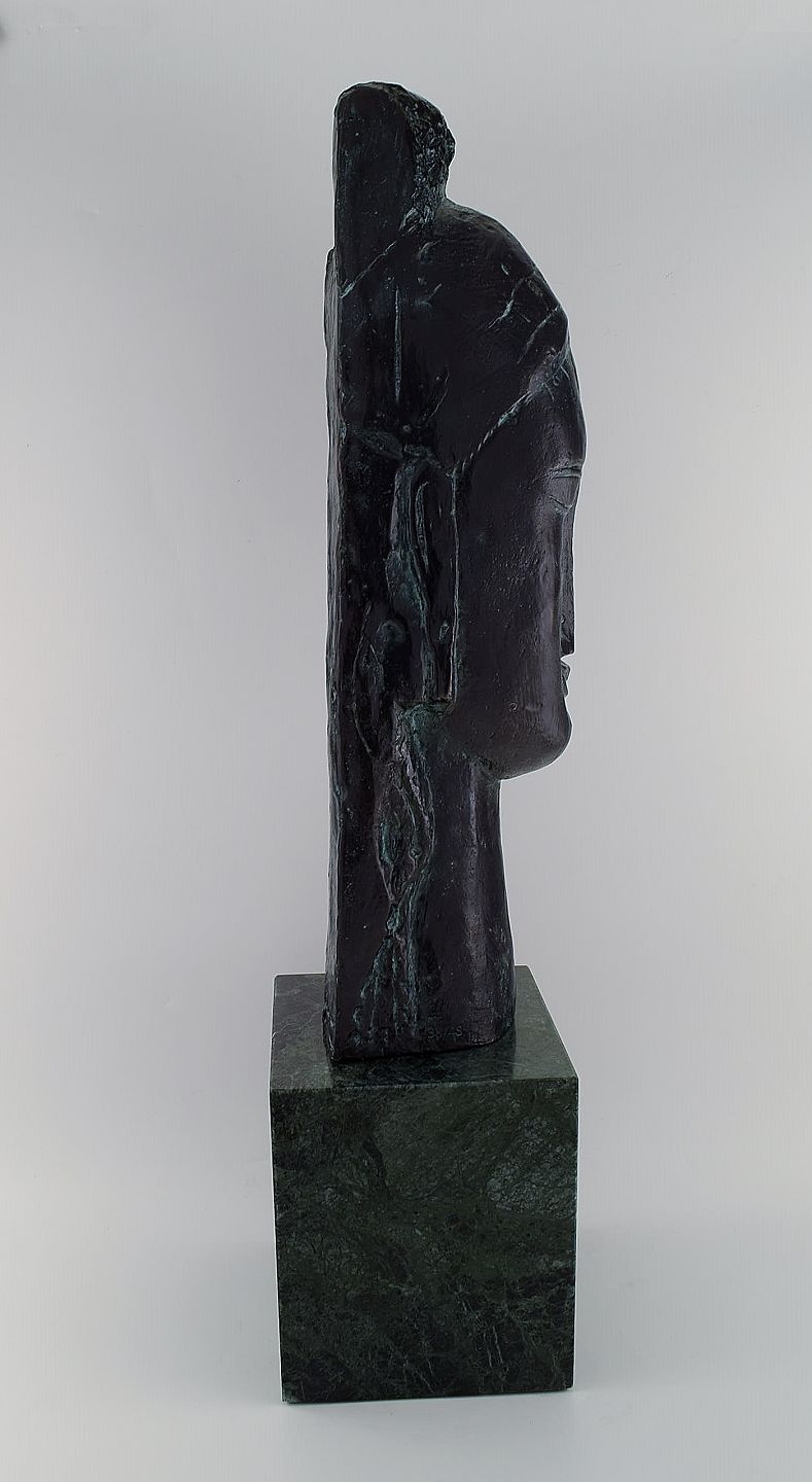 Amedeo Clemente Modigliani (1884–1920) d´après. "Tête de jeune femme". Large bronze sculpture in solid bronze on green marble base. Bronze foundry: Ebano, Spain. Limited edition 38/48. Heavy bronze sculpture in high quality. Late 20th century.