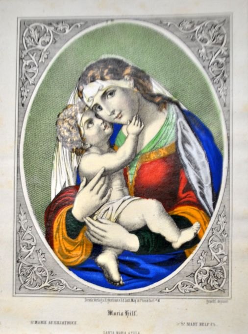 Tysk kunstner (19. årh.): Maria Hilft. Håndkoloreret litografi. Tryk: 16,5 x 13 cm.