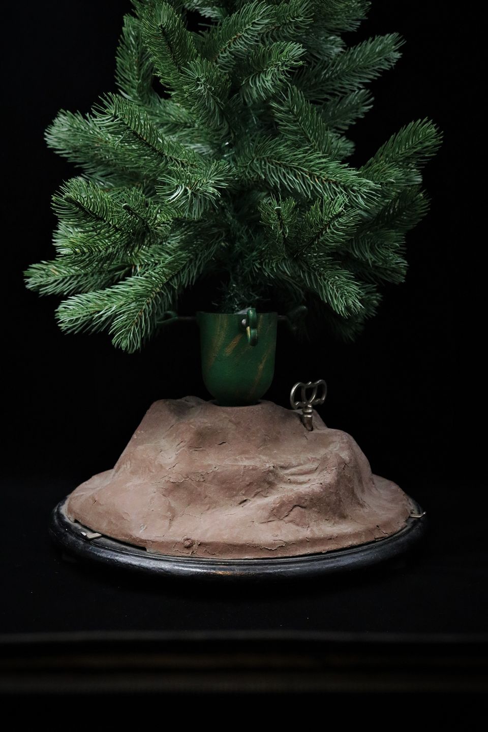 i metal / papmache med spilledåse så juletræet kan dreje rundt samtidig med den spiller julemelodier.