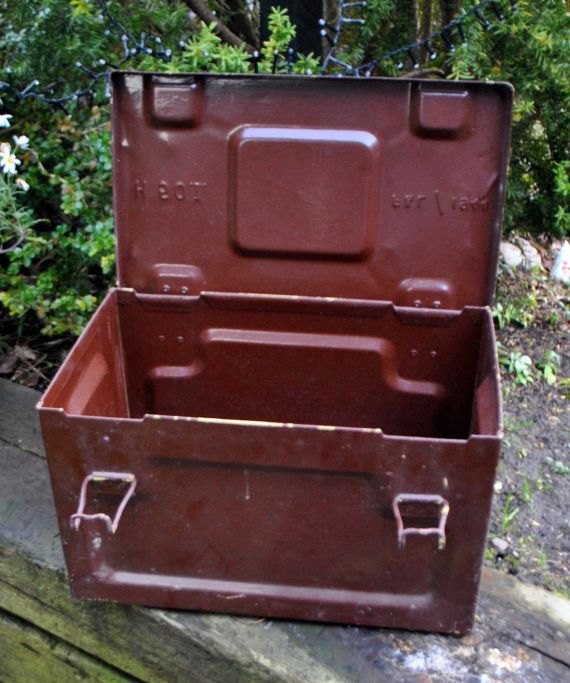 WW2, American ammunition box in painted metal with handle, 1944. H: 26.5 cm. L .: 45 cm. W .: 26.5 cm.
