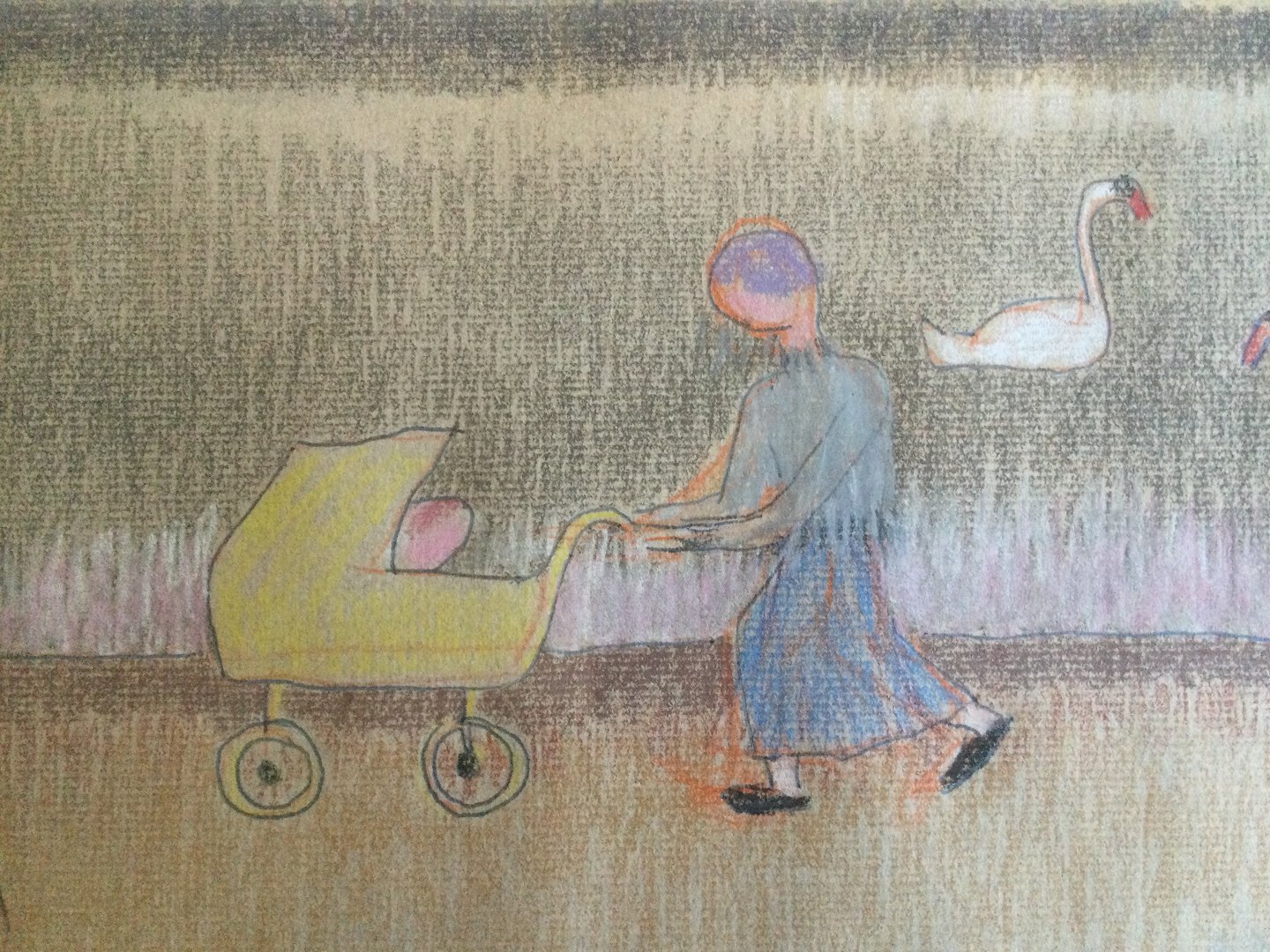 Oliekridt tegning af Johannes Dührkop 1974 - Pige med barnevogn.