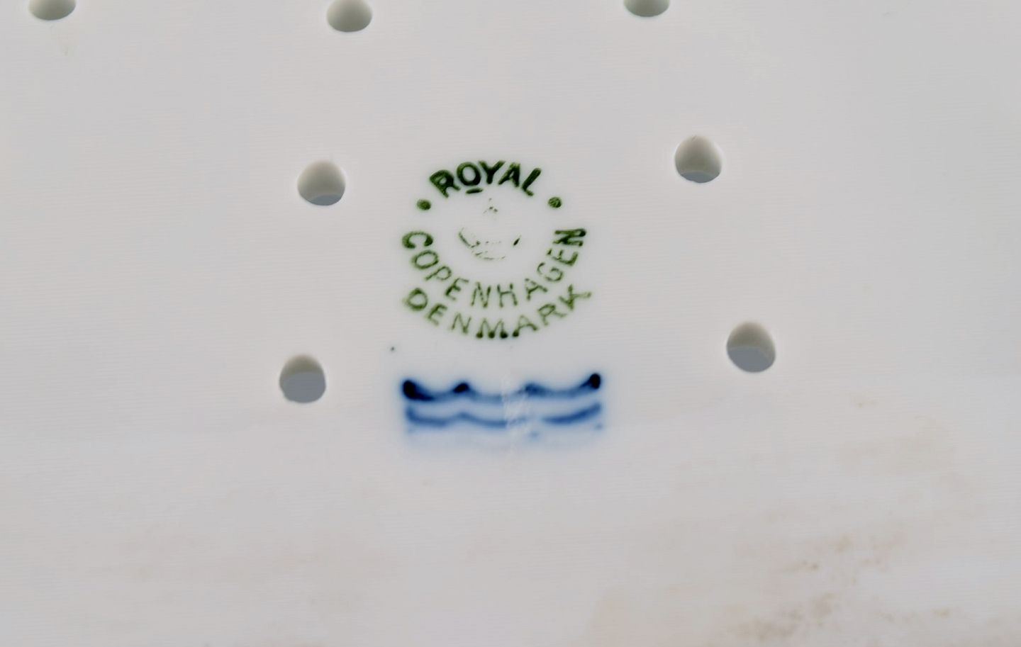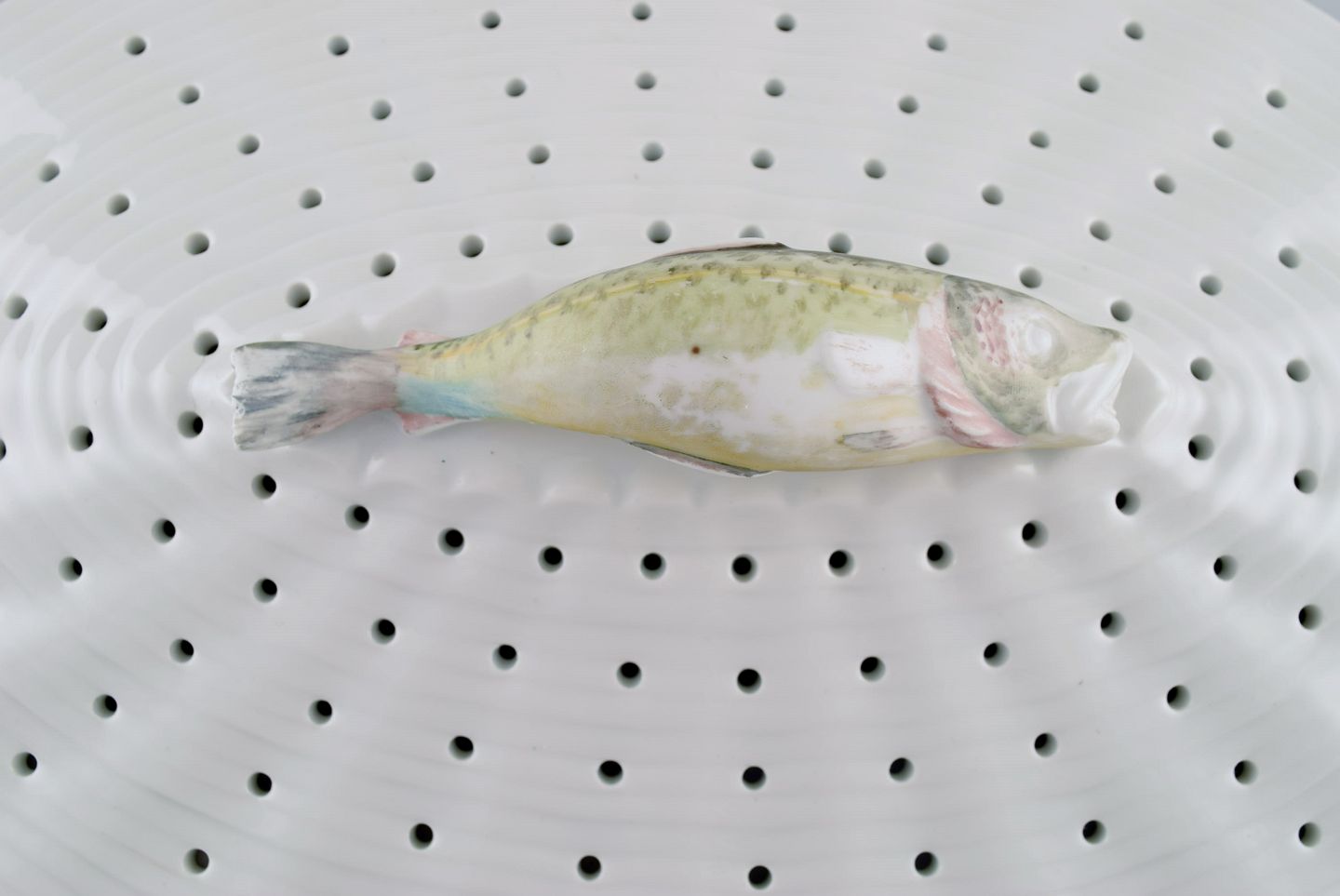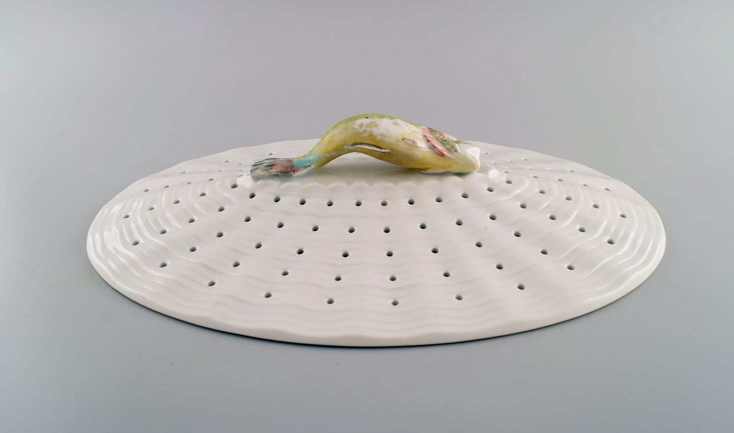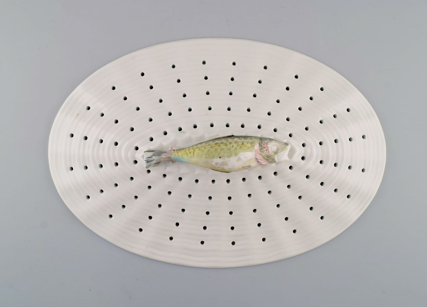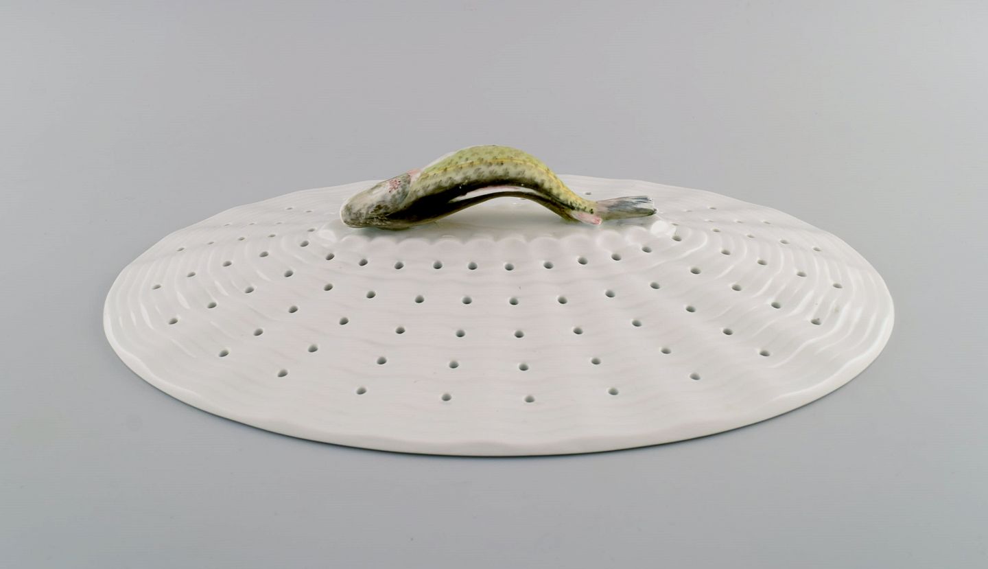 Large Royal Copenhagen fauna danica/flora danica porcelain fish strainer modeled with hand-painted fish. Dated 1951.