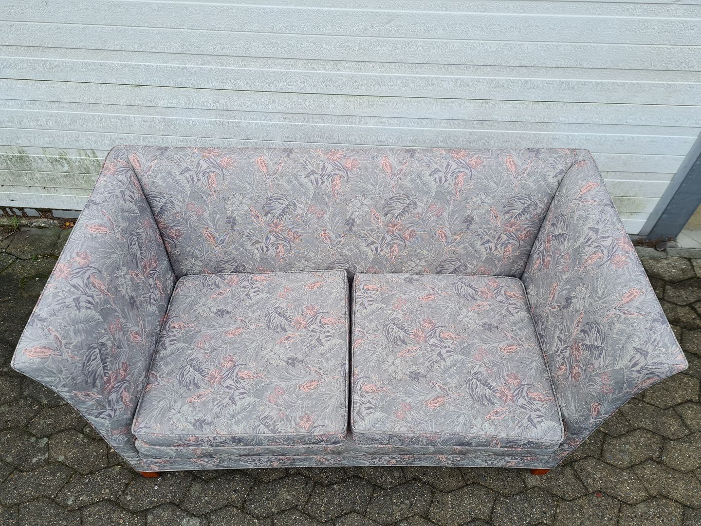 Lille sofa i stof betæk fra 1990erne. Den har brugsspor.