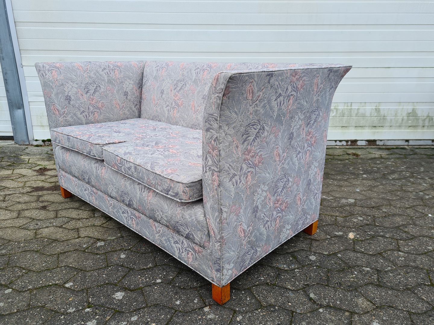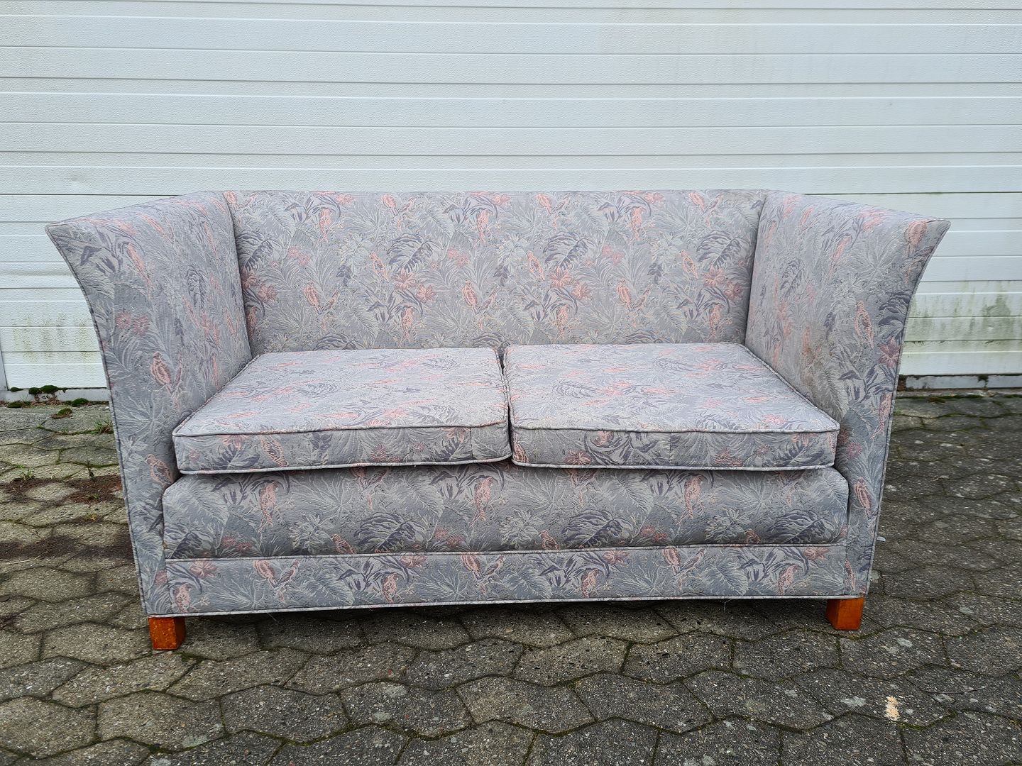 Lille sofa i stof betæk fra 1990erne. Den har lidt brugsspor.