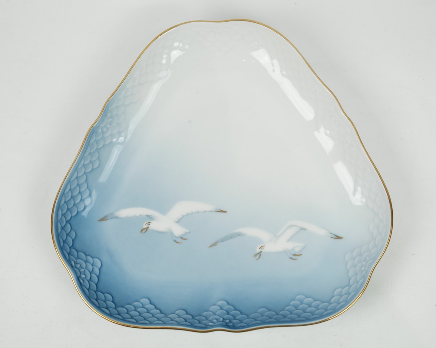 Trekantsfad fra Bing & Grøndahl i mågestel med fin guldkant. Står i fin brugt stand.
