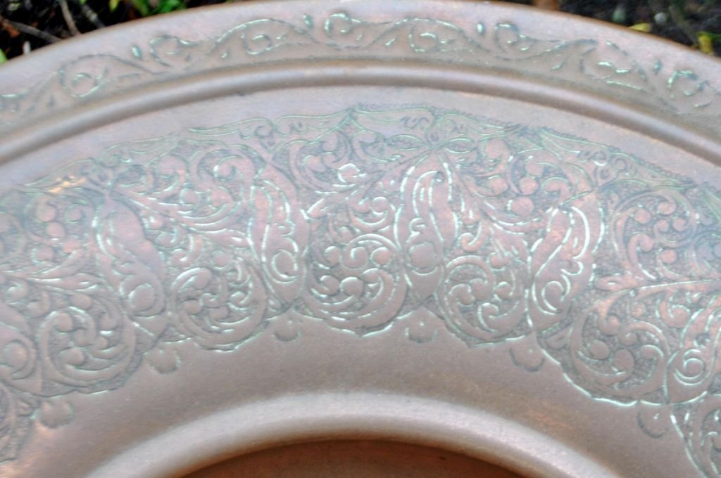 Stort antikt dåbsfad i kobber, 19. årh. Danmark. Med talrige hamrede dekorationer i form af bladværk. H.: 12 cm. Dia.: 40 cm.