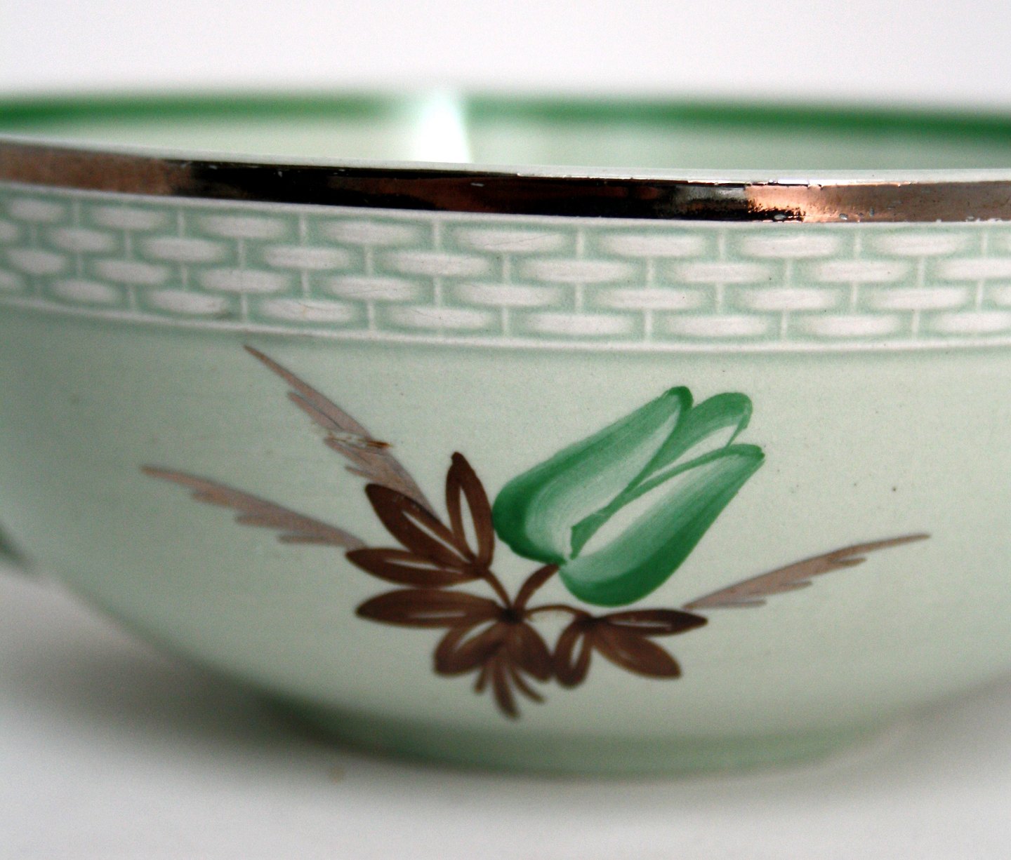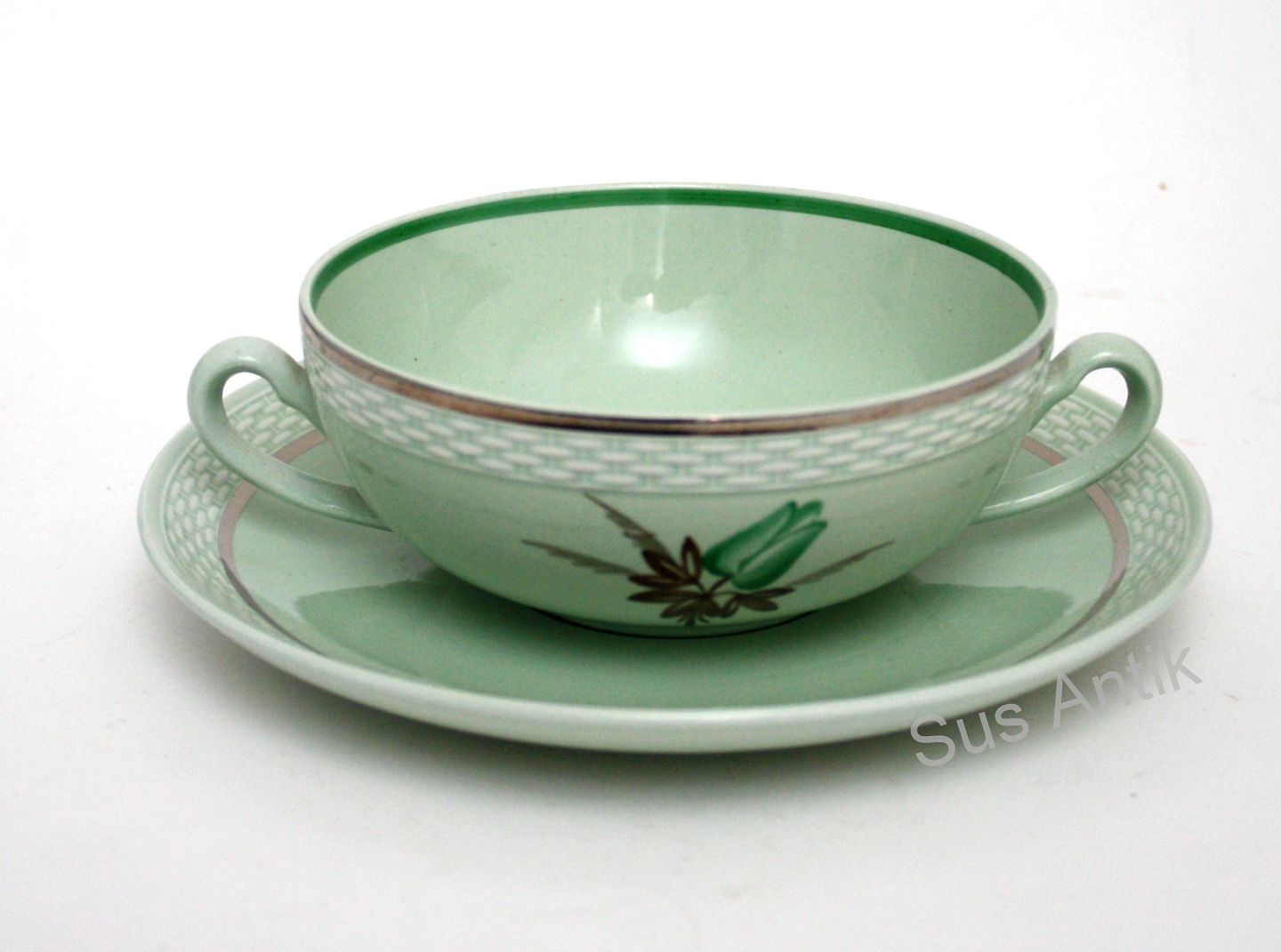 Text available in Danish: Aluminia, Hardenberg, Boullionkop med underkop. Hardenberg er lysegrønt stel dekoreret med håndmalet grøn og brun blomstermotiv og med udvendig sølvkant. Designet af Nicolaj Tidemand i 1934. Det er et af de mere sjældne stel. Grundstellet er Victoria II stellet med runde former fra 1933-67 designet af Nils Thorsson.