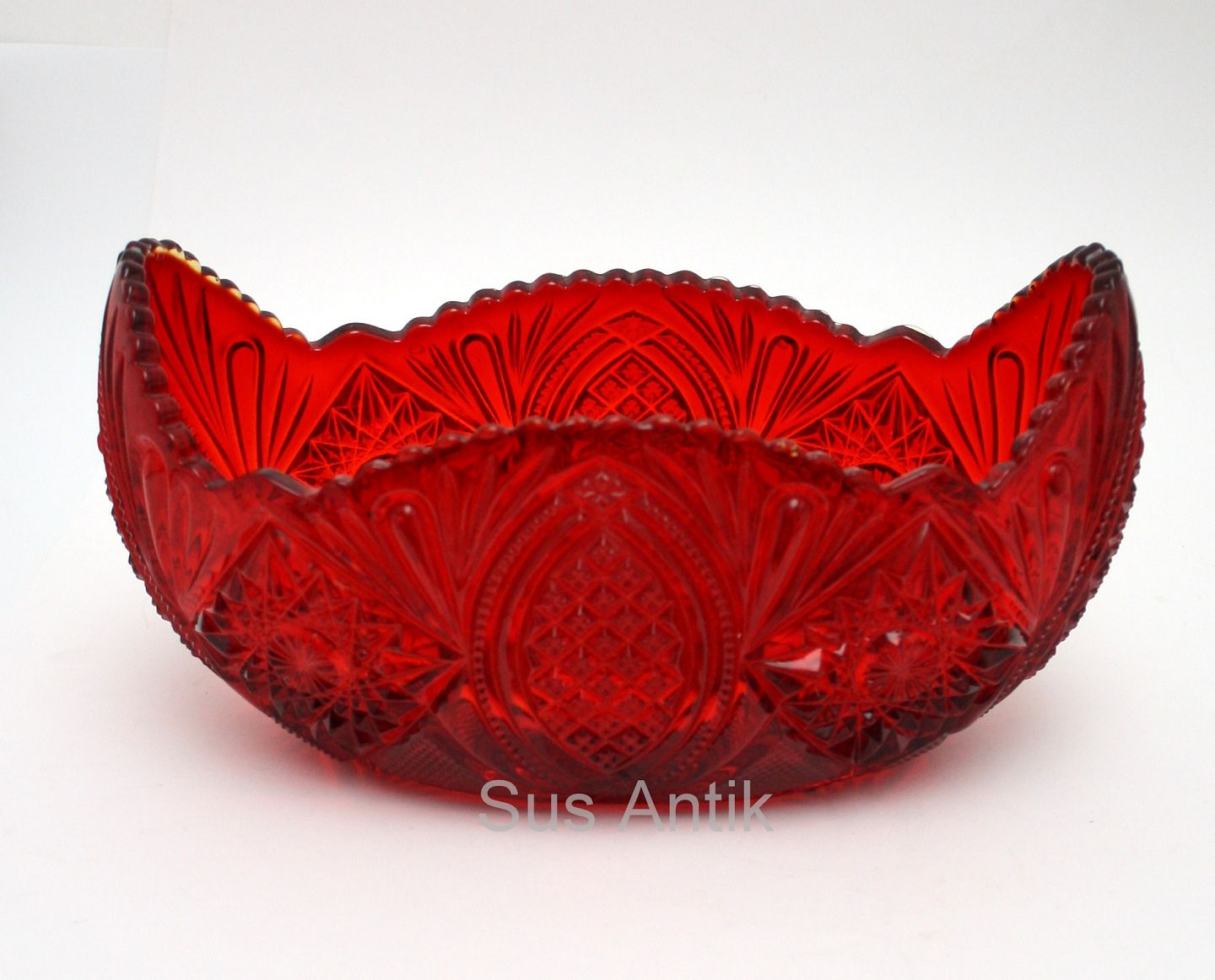 Text available in Danish: Brockowitz, Tyskland 1915, Jardiniere i rubinrød presset glas i Zürichserien. Længde 23 cm. Bredde 13 cm. Højde 12,5 cm. Fin og hel stand. Pris: 650 kr. stk. Lager: 1
