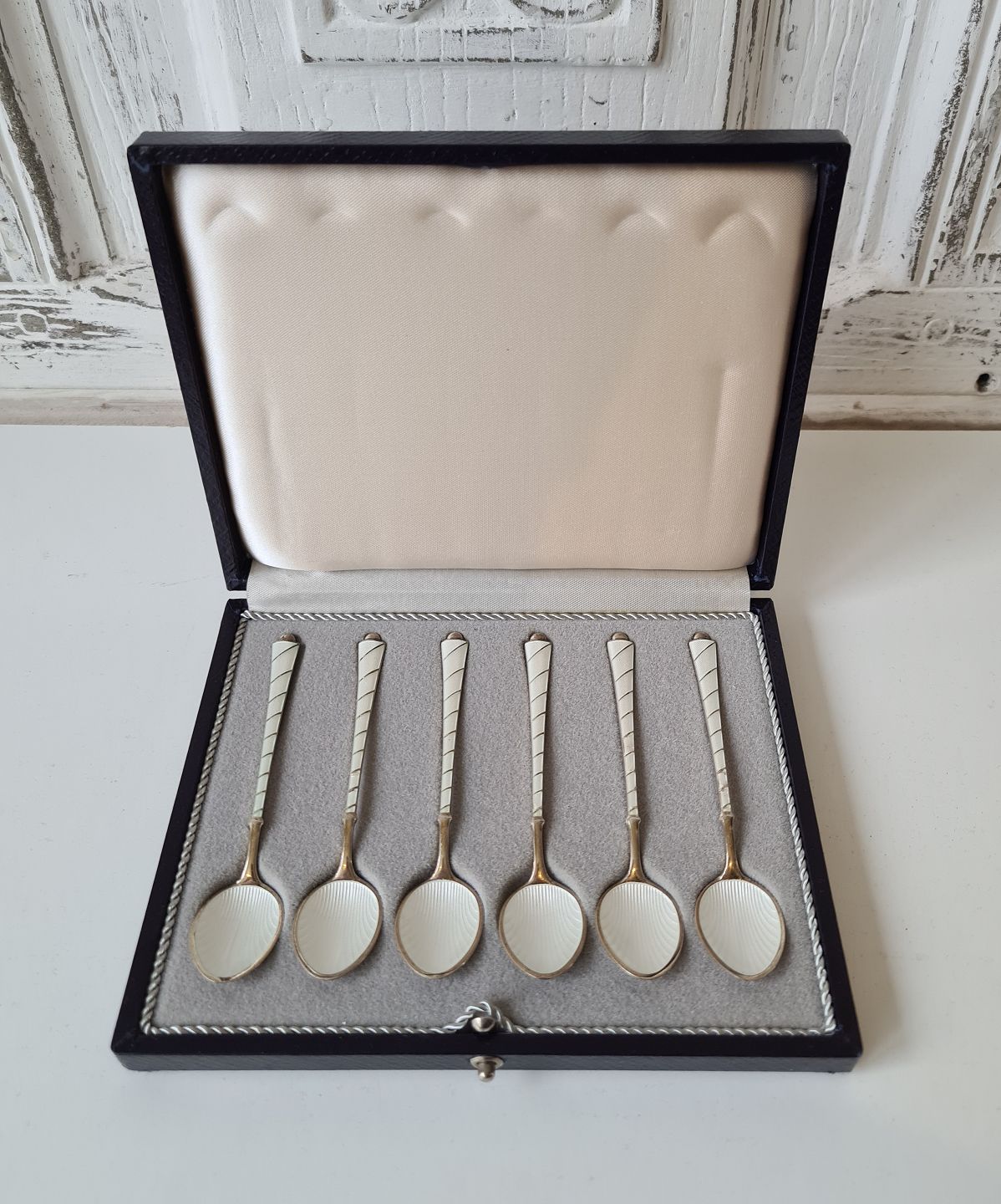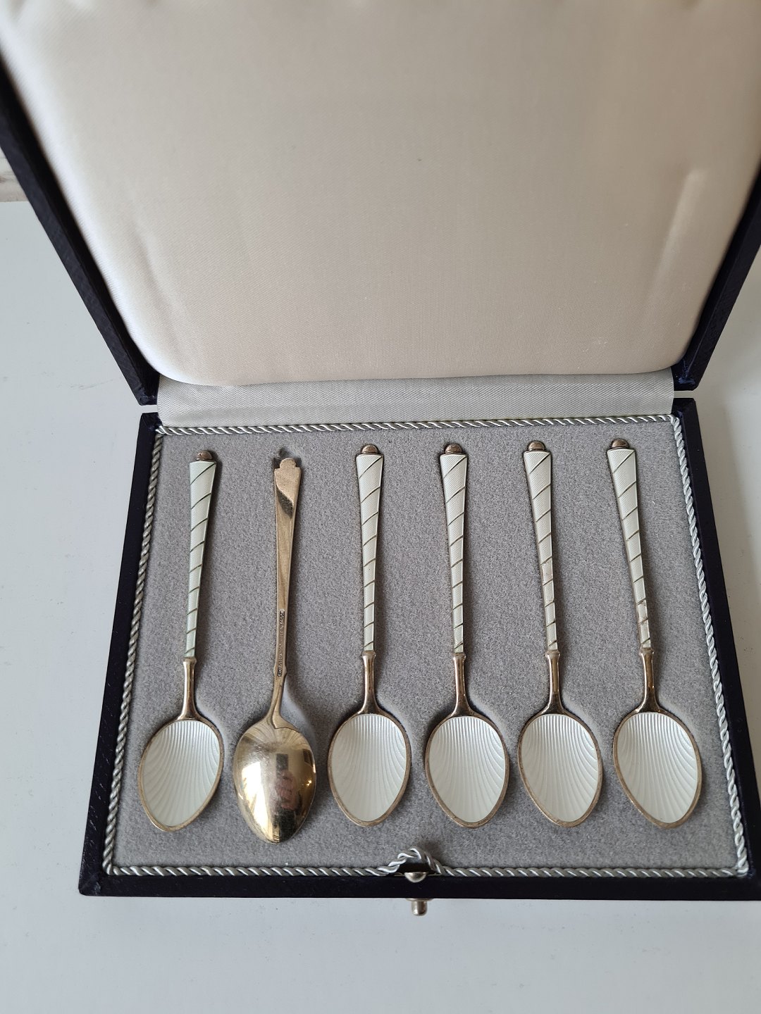 Set on 6 mocha spoons in gold-plated sterling silver and enamel Stamped: E.La - Sterling - Denmark