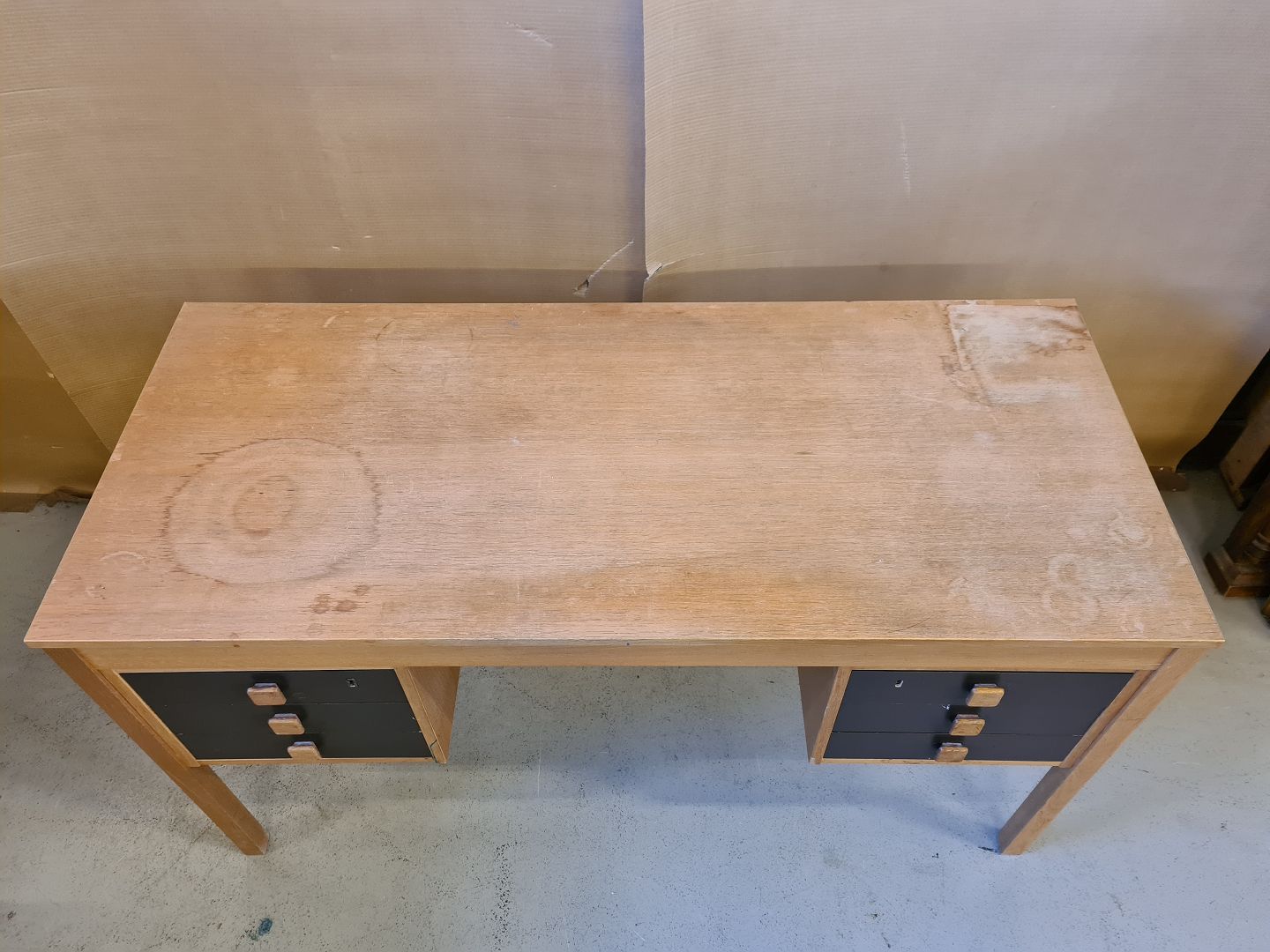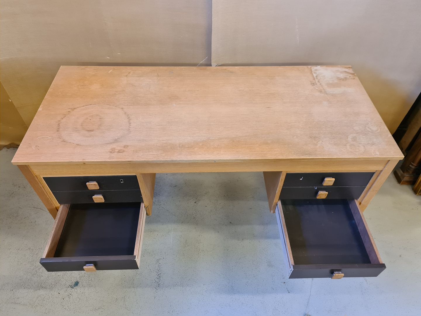 Skrivebord i fineret egetræ fra 1970erne.