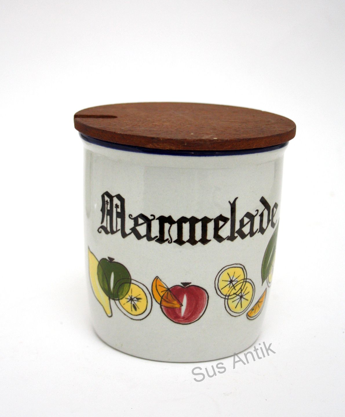 Marmelade med låg med plads til ske (stor). Højde 11 cm. Diameter 10,5 cm. Overfladekrakeleringer indvendig. Pris: 150 kr.