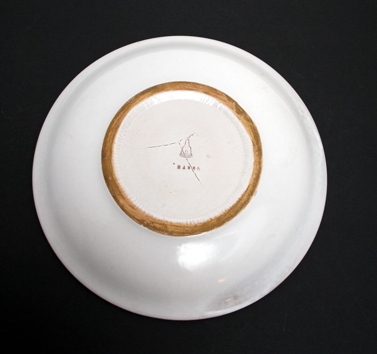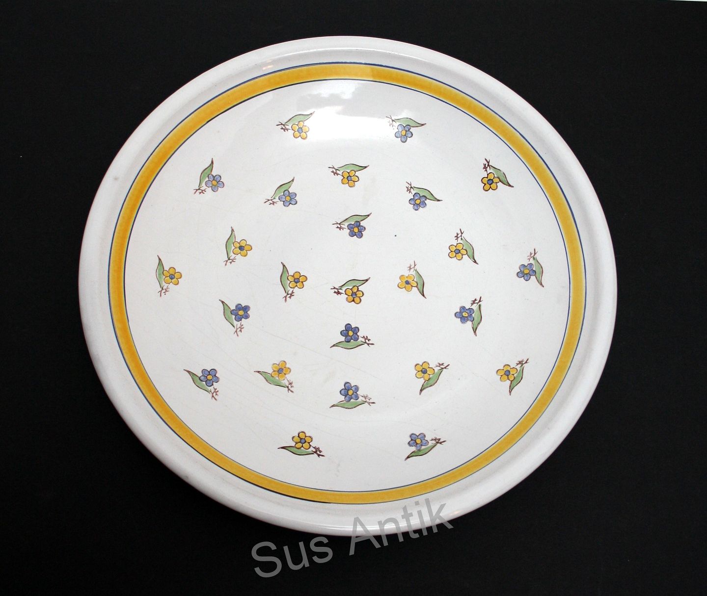 Knabstrup, Birte. Testel det første navngivne testel fra 1942 opkaldt efter Knabstrups direktør Frida Schous niece. Stellet er i majolica med håndmalede små strøblomster i gule og blå nuancer. Stort rundt fad nr. 8A/805. Højde 4 cm. Diameter 29 cm. Fin stand med enkelte overflade krakeleringer/brugsspor. II sortering. Pris: 350 kr.