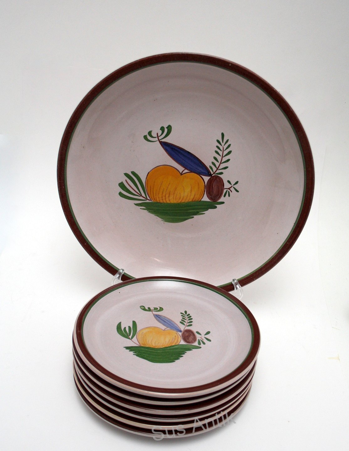Knabstrup, Frugttallerkener og fad fra 1940'erne. 6 tallerkener diameter 18,5 cm og 1 fad diameter 28 cm. Højde 4 cm. Fin stand. Pris samlet: 650 kr.