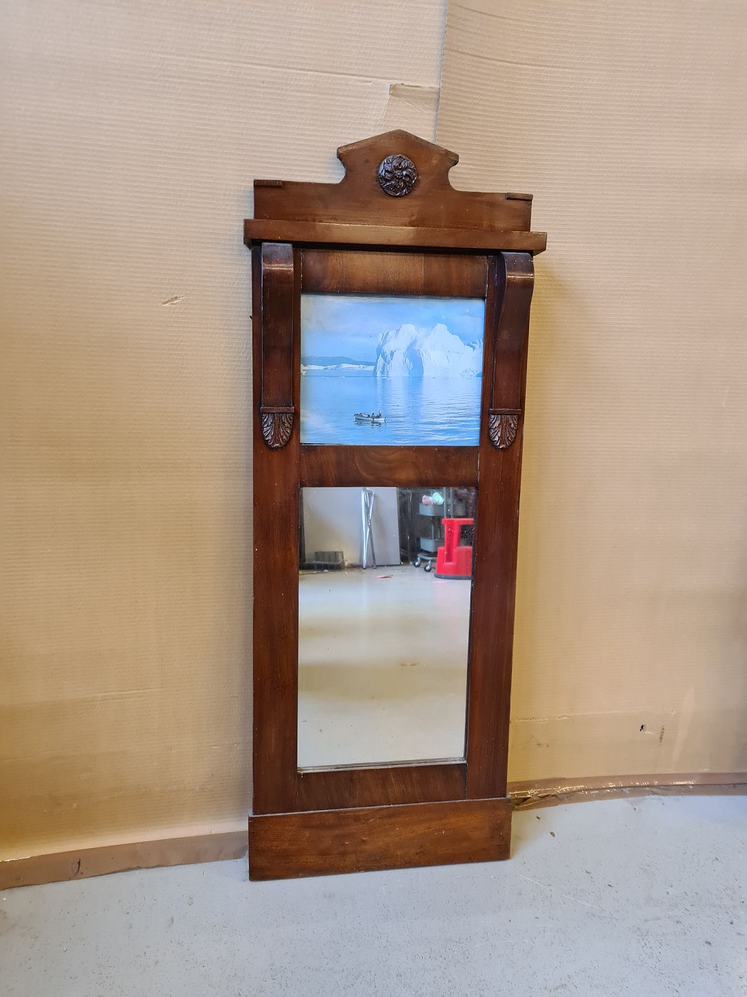 Spejl i fineret mahogni fra 1900erne.