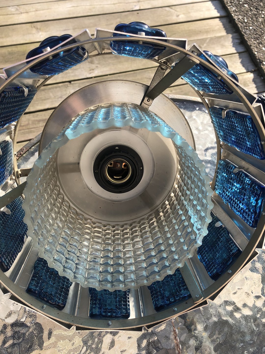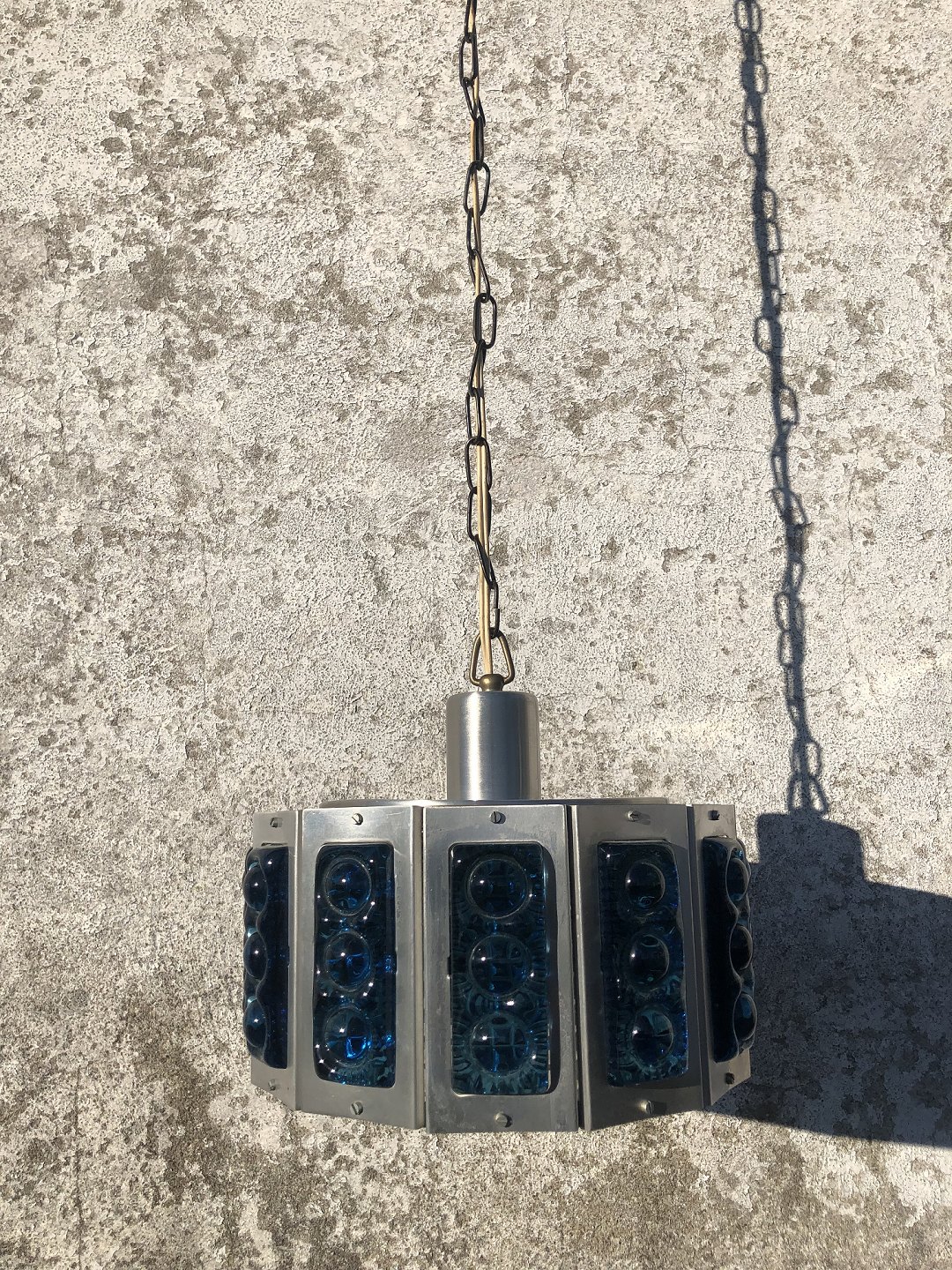Lampe fra 1960'erne i aluminium og med blå glas. Diameter ca 26 cm *Fremstår med en lille ubetydelig sprække i det indre glas - ellers pæn stand*