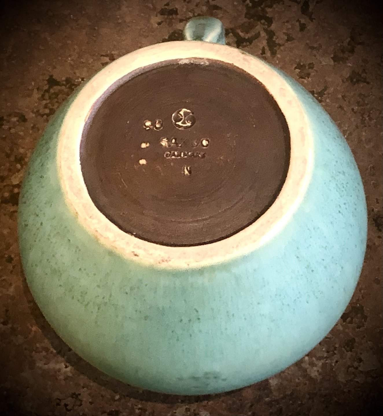 Saxbo Kande med heh36 (Caribbbean) glasur. Model 90. Stemplet med Ying Yang mærke fra perioden 1938-1951. Mål H. 16 cm. X 17 x14,4 cm.#28