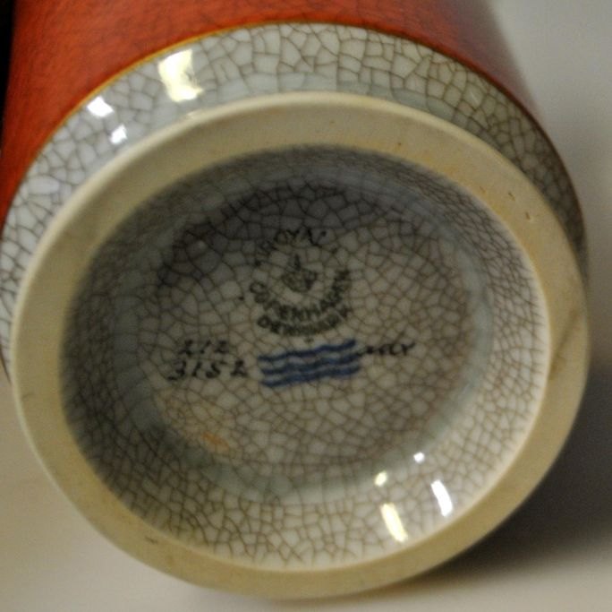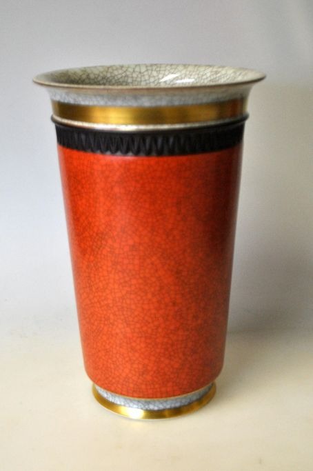 Royal Copenhagen, craquelle vase, 212/3152, 20. årh. København, Danmark. Grålig porceænsmasse med røde og brune overmalinger. Med forgyldning. Stemplet. H.: 18,5 cm.