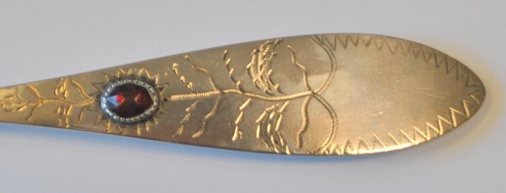 Sølvske med rød glasflus og dekorationer, 1836. Danmark. Mester Thomas Petersen Kohlby (1795 - 1856) Tønder. Stemplet. Længde.: 22,5 cm. Verso indgravering: E.R 1836 (senere).