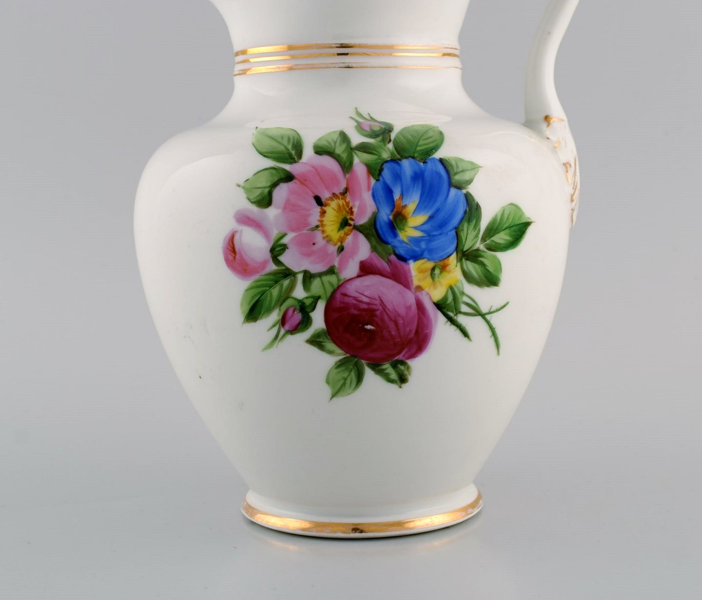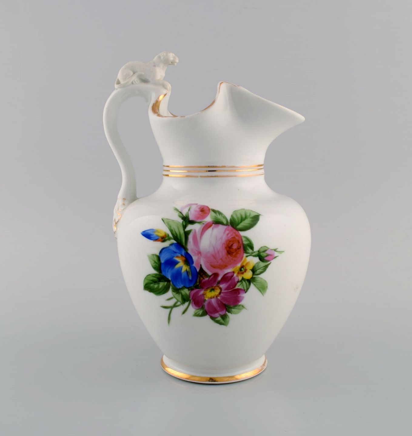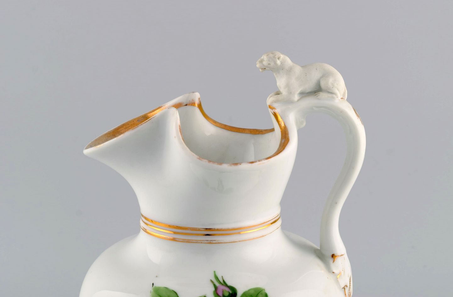 Antik Bing & Grøndahl chokoladekande i porcelæn modeleret med løve på hanken. Håndmalede blomster og gulddekoration. 1870'erne.