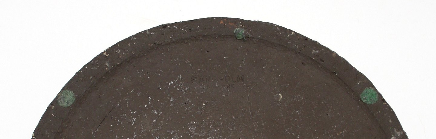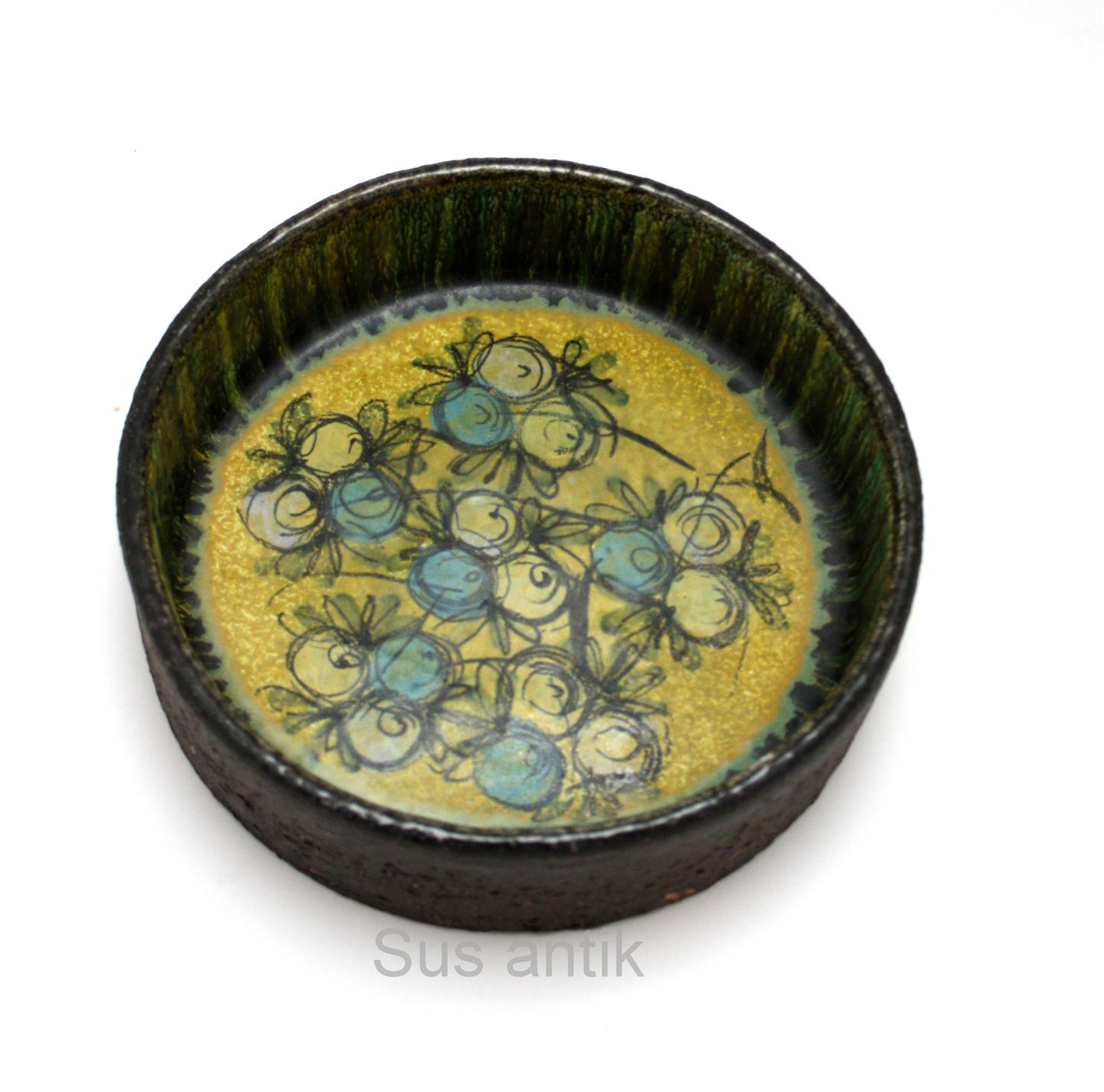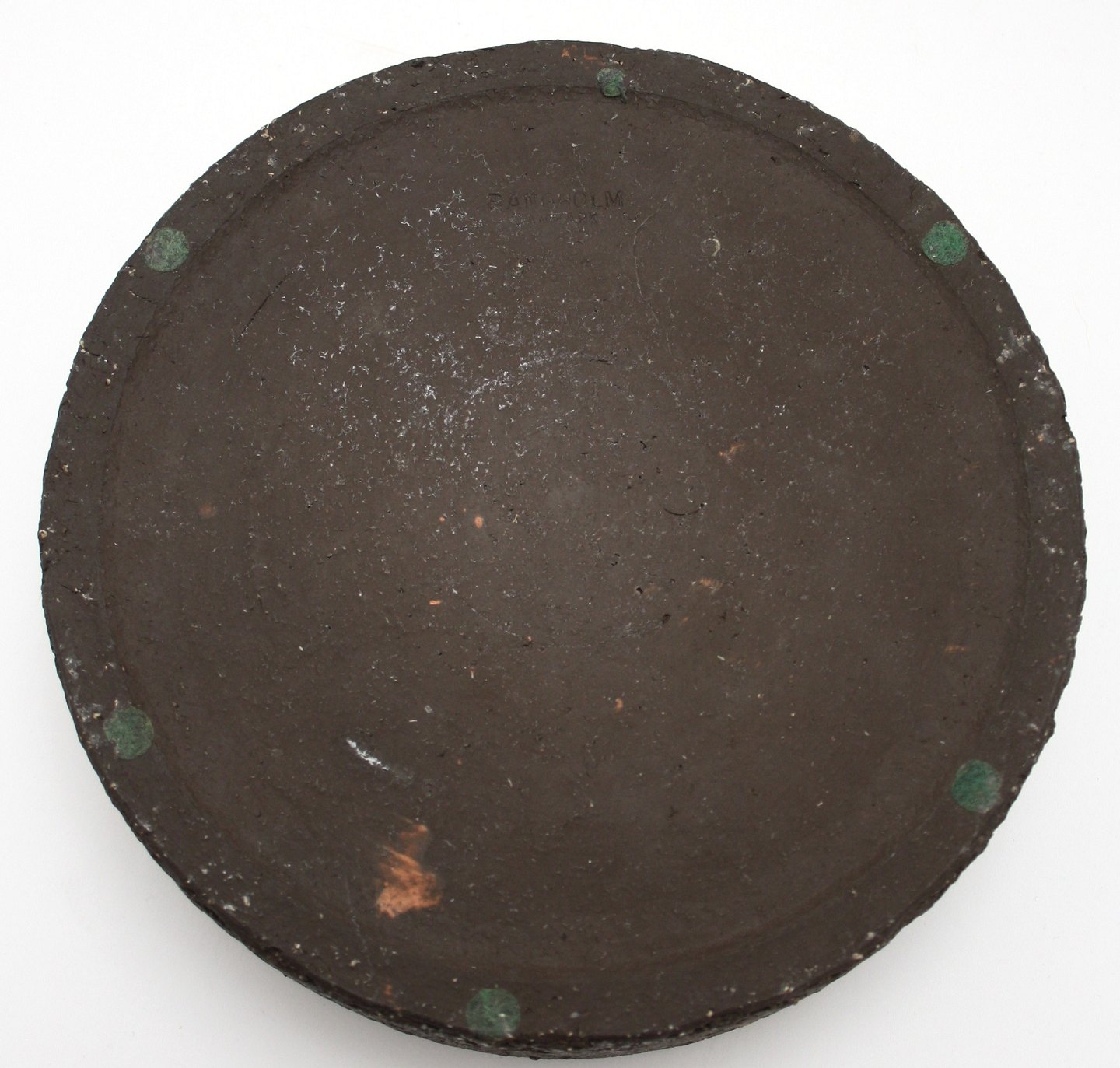 Bangholm keramik, Skål eller fad med indvendig glasur med frugtmotiv. Højde 5,5 cm. Diameter 20 cm. Fin stand med et ubetydeligt afslag indvendig i kanten, fremstår lysere i glasuren. Pris: 275 kr.
