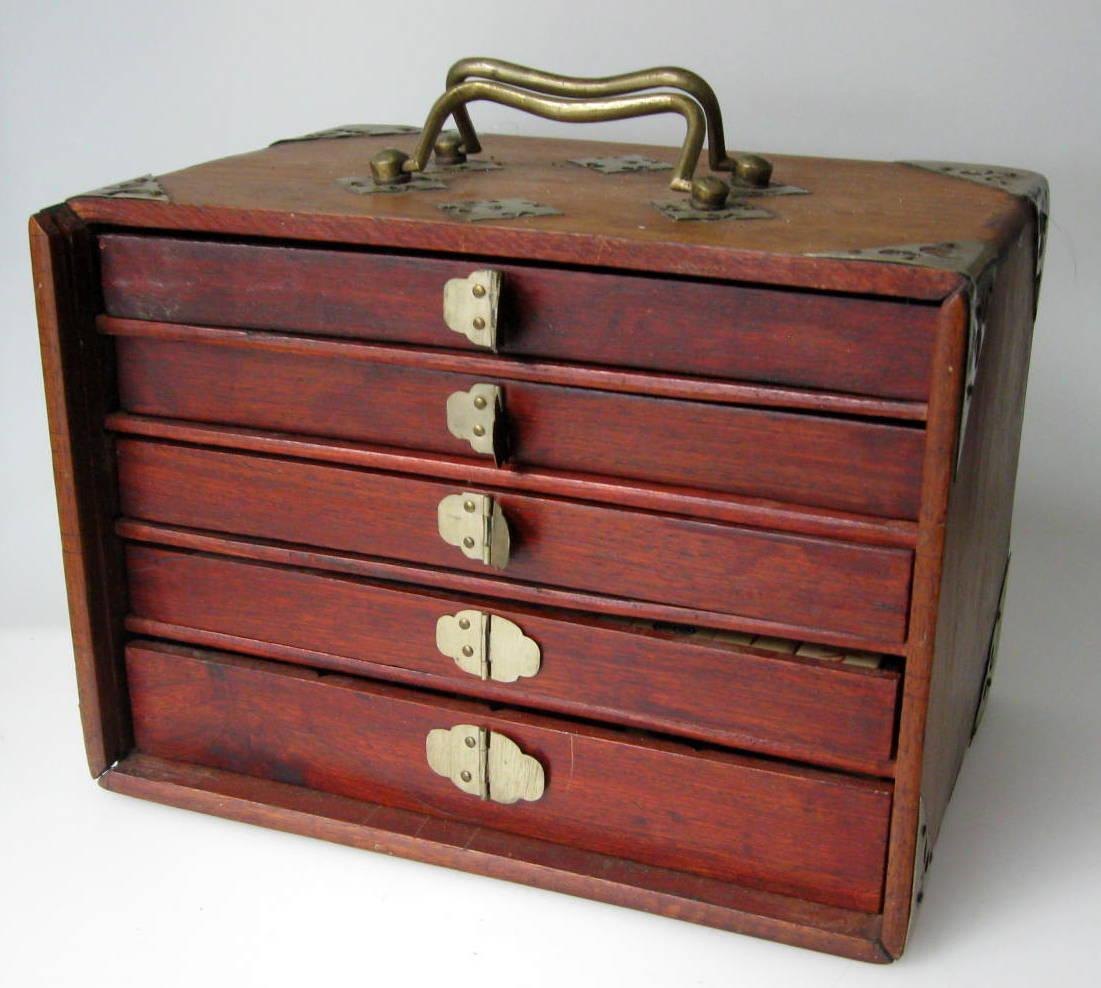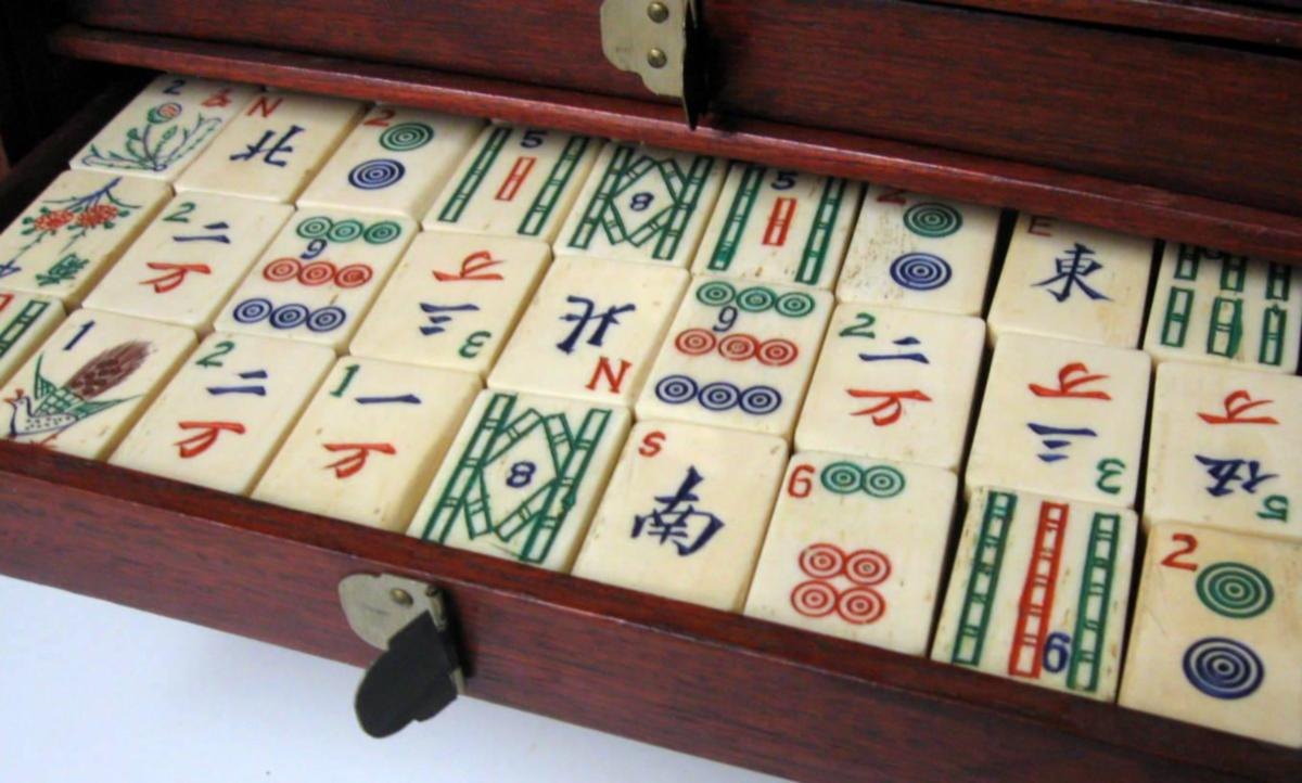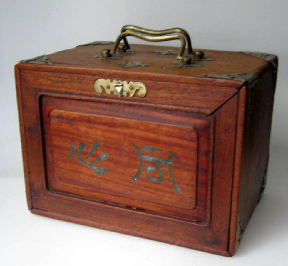 Kineisk mahjong spil, 19. årh. I æske af ædelt træ med beslag og håndtag i messing. Indeholdende 5 skuffer med brikker af ben pålimet bambus. Hver brik med tegn og tal. H.: 17 cm. L.: 24 cm. D.: 16,5 cm.