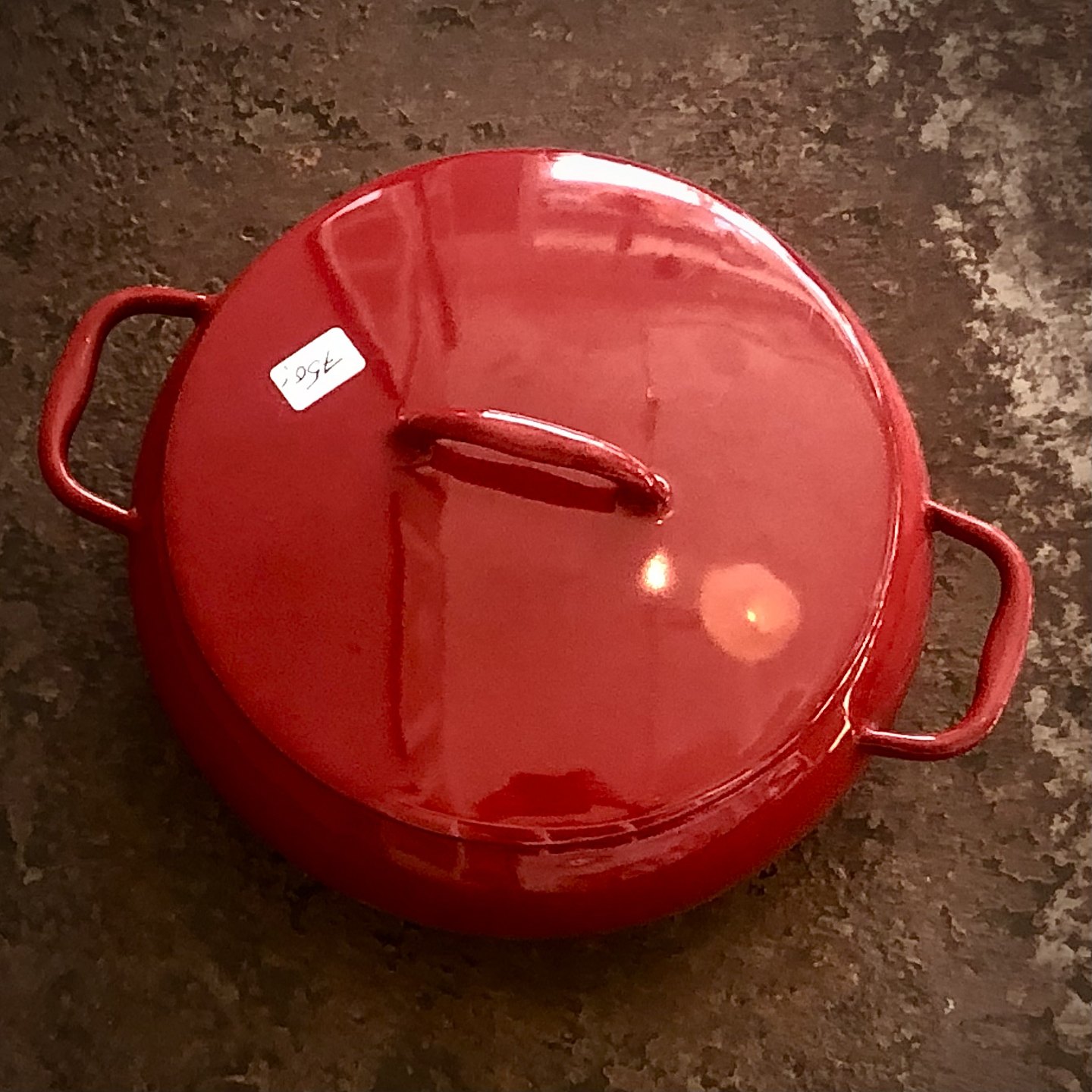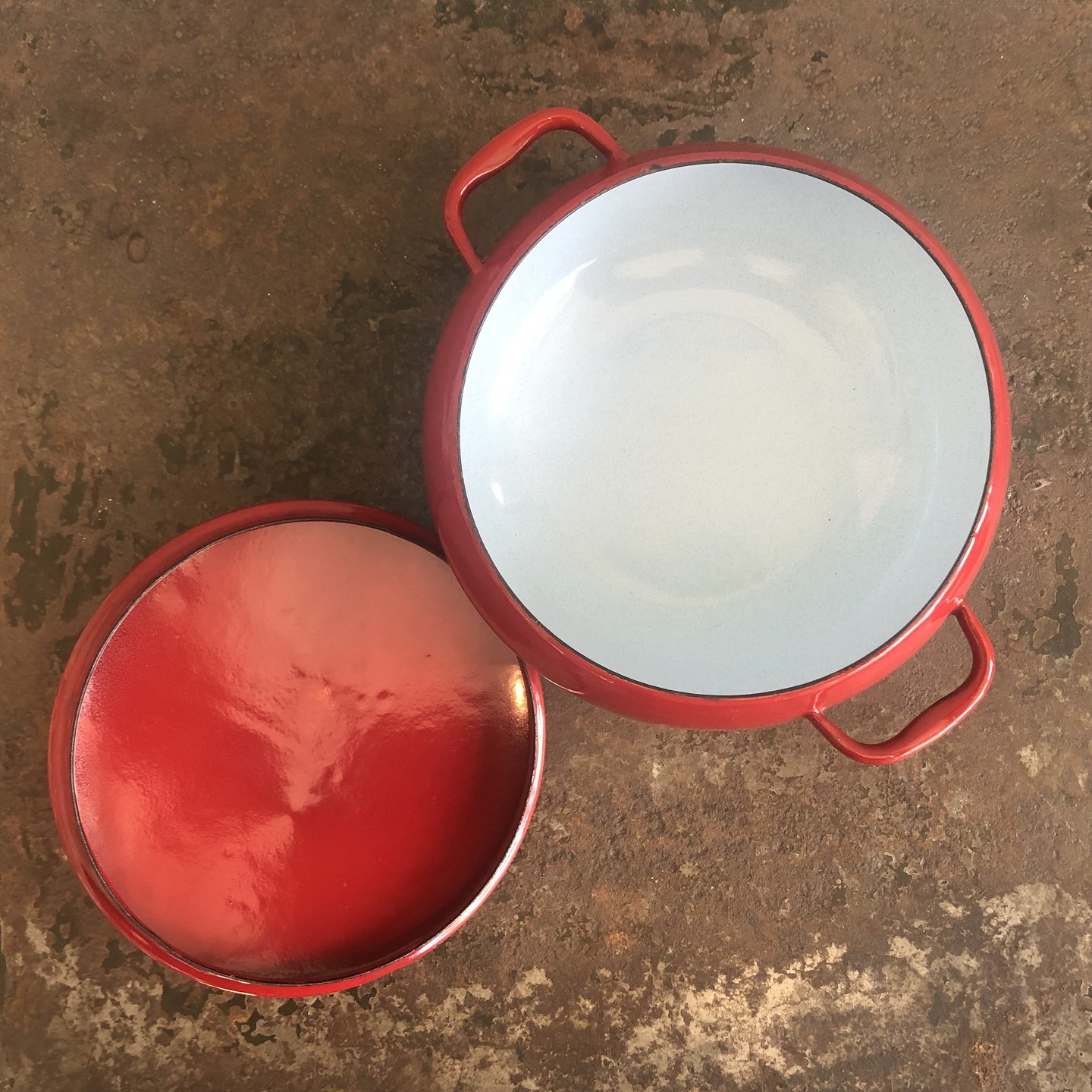 Gryde med låg af metal med mørk rød emalje og indvendig med lys blå blank emalje.H. 11 cm. Ø 18/22 cm.