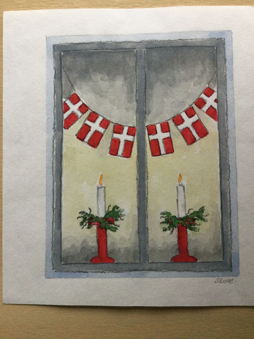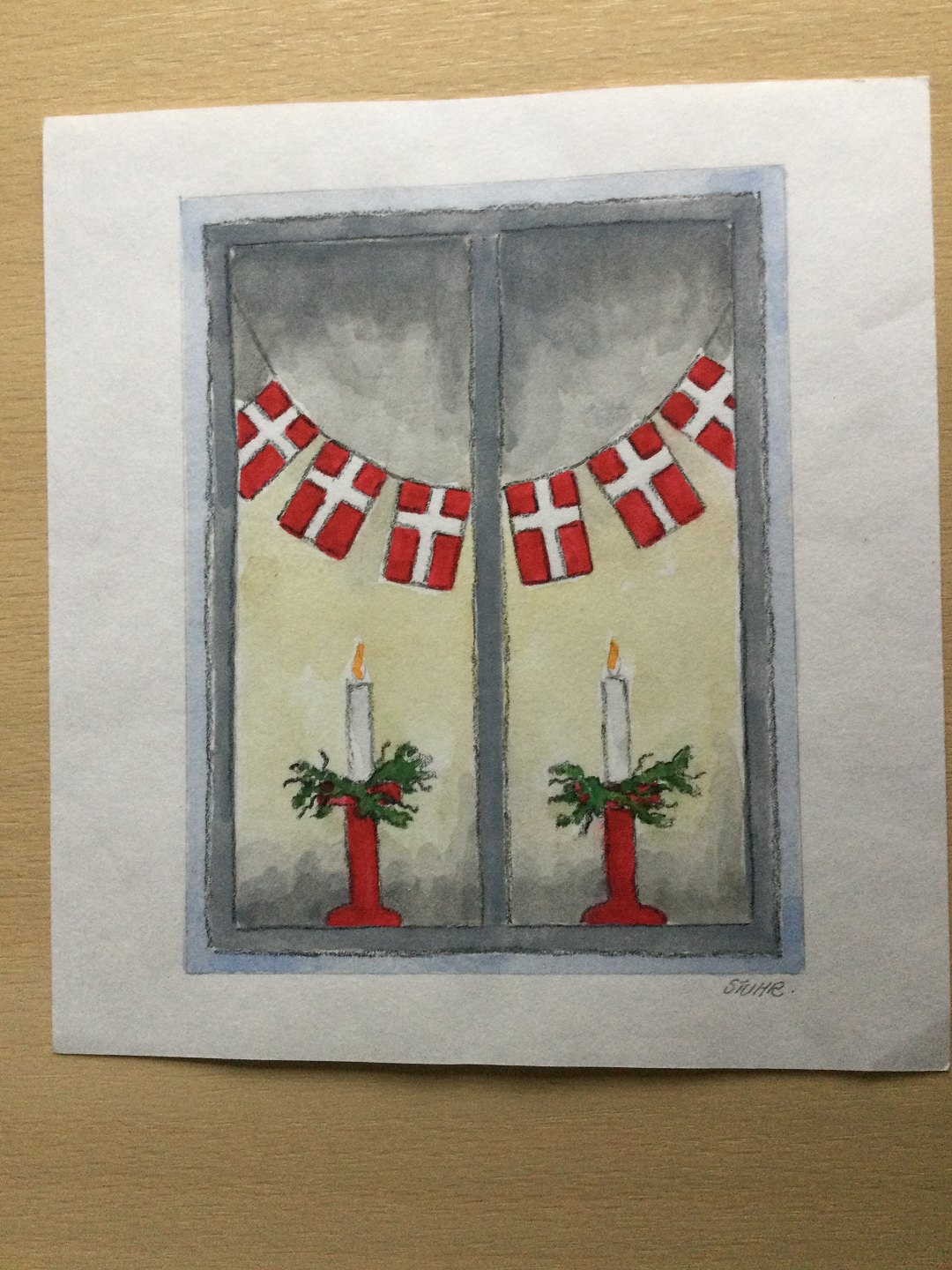 Akvarel af Erik Stuhr - Vindue med julelys og Dannebrogsguirlande.