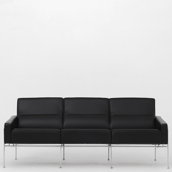 Model AJ 3303 - Nybetrukket 3 personers 'Lufthavnssofa' i sort (semi-anilin) Klassik-læder på stel af stål. Formgivet i 1956.