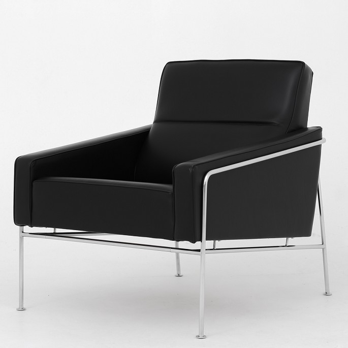 Model AJ 3301 - Nybetrukket 'Lufthavnsstol' i sort (semi-anilin) Klassik-læder på stel af stål. Formgivet i 1956.