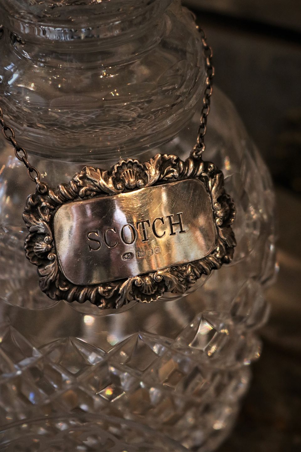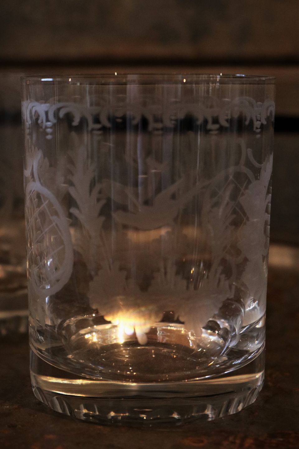 Old whiskey glass, decorated with polished motifs of deer and birds.