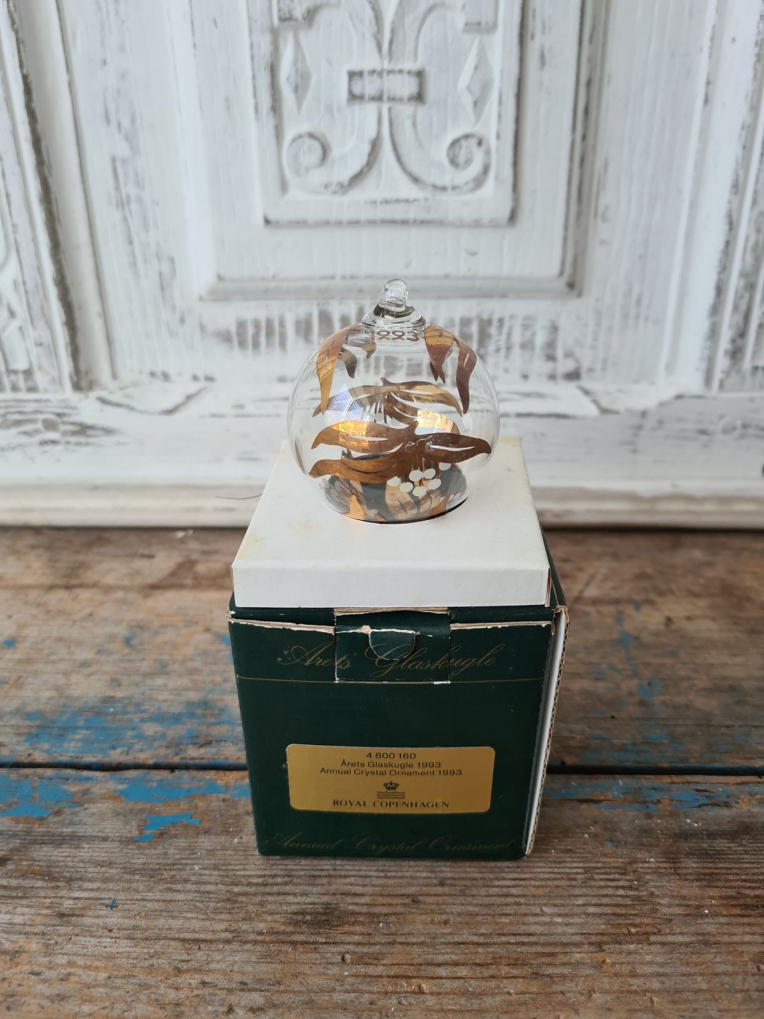 Royal Copenhagen glas julekugle fra 1993 med originalt bånd og æske