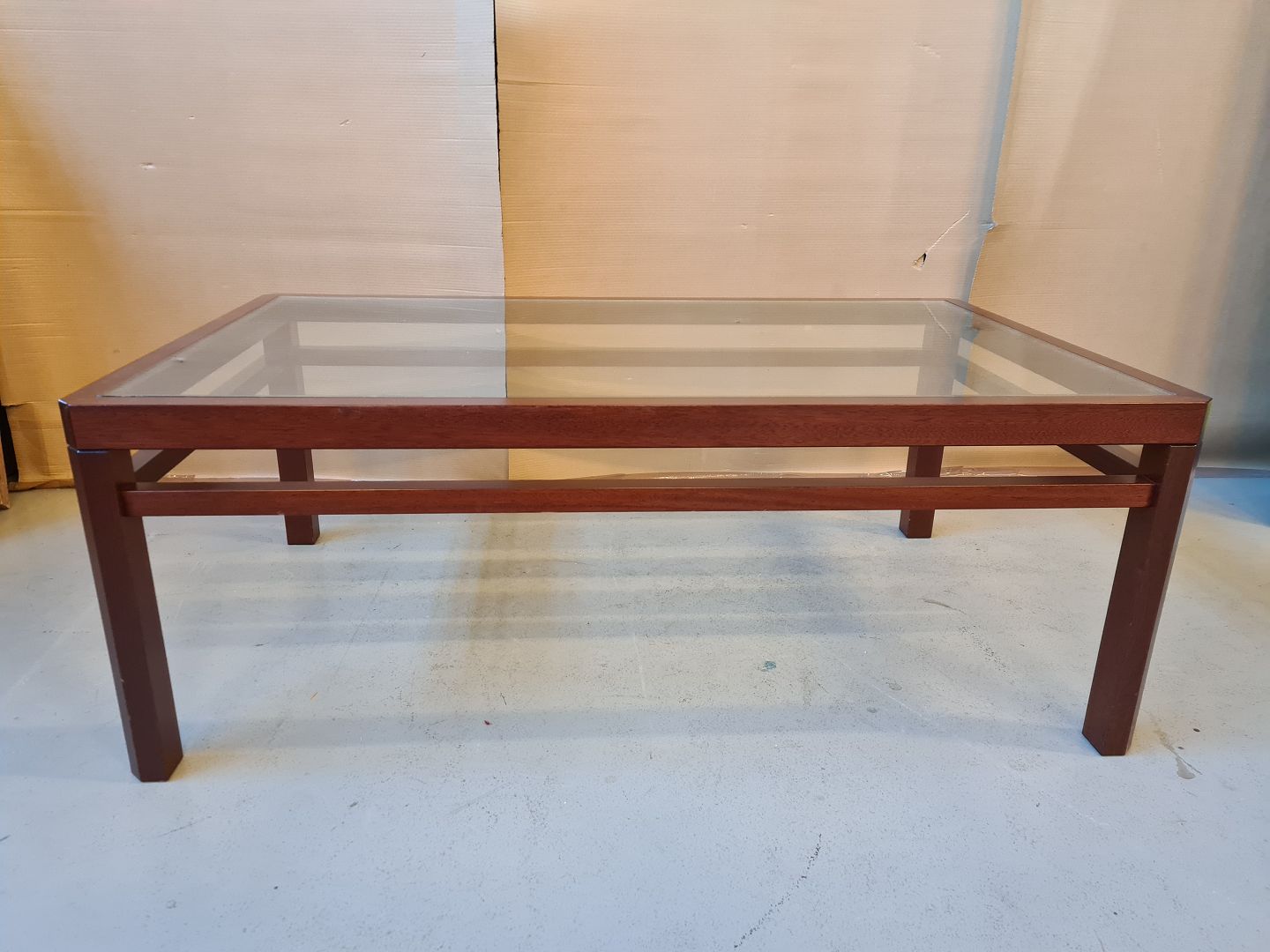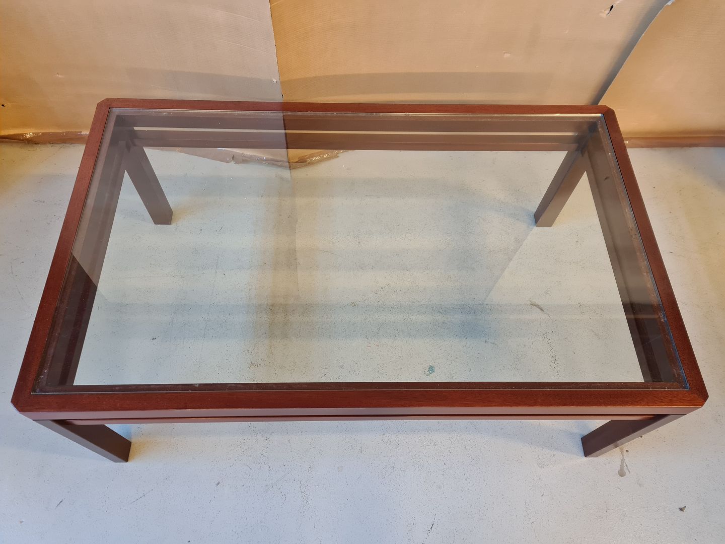 Sofabord i fineret mahogni med glasplade fra 1980erne.